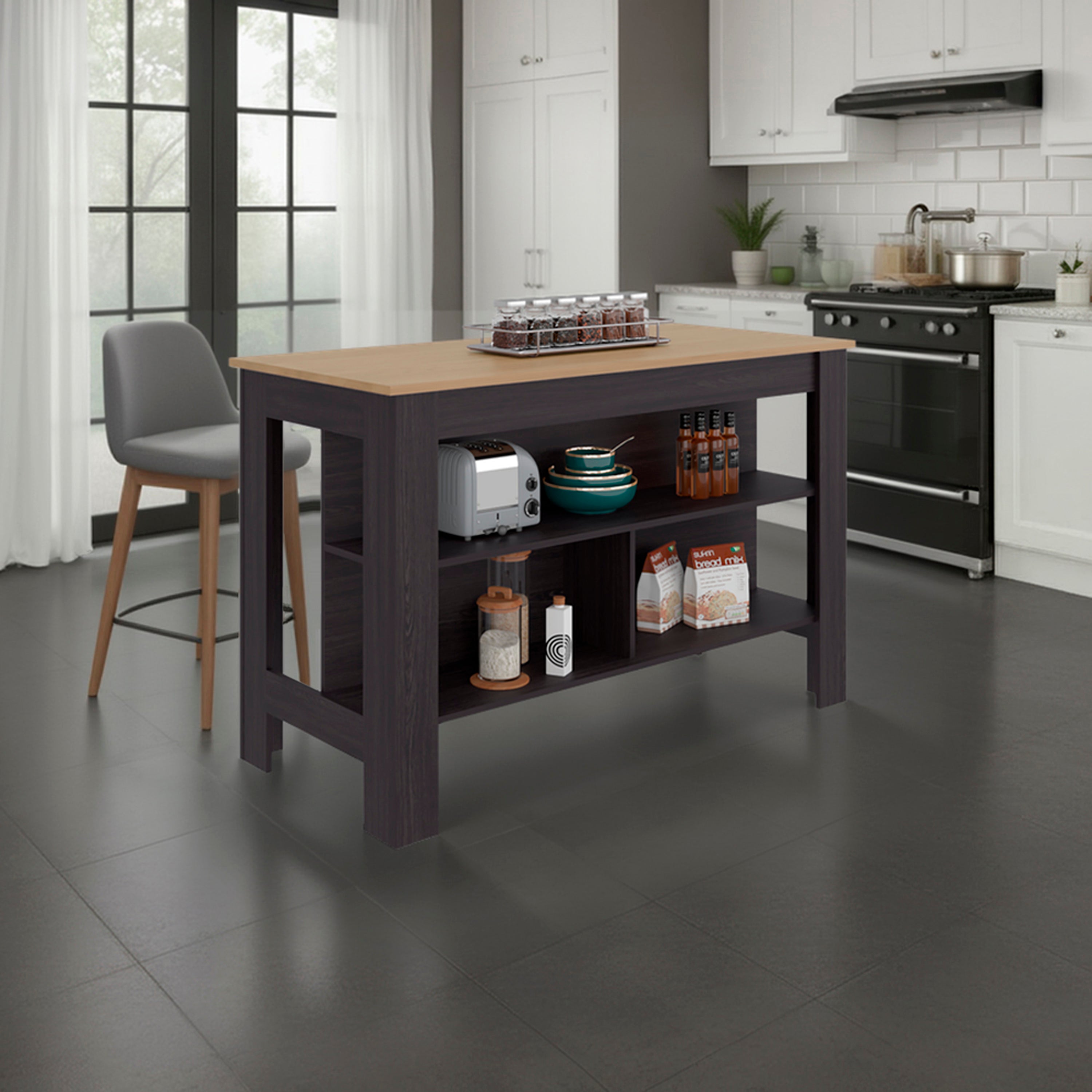 Cala wide kitchen island with spacious tabletop, three open storage shelves, four sturdy legs and comfortable meal prep workstation