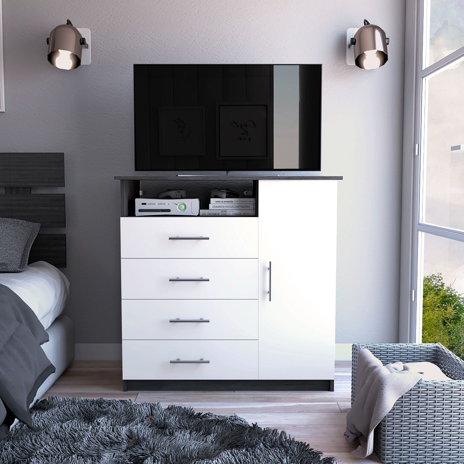 Sierra freestanding dresser with four drawers, one cabinet and one open shelf, modern bedroom storage