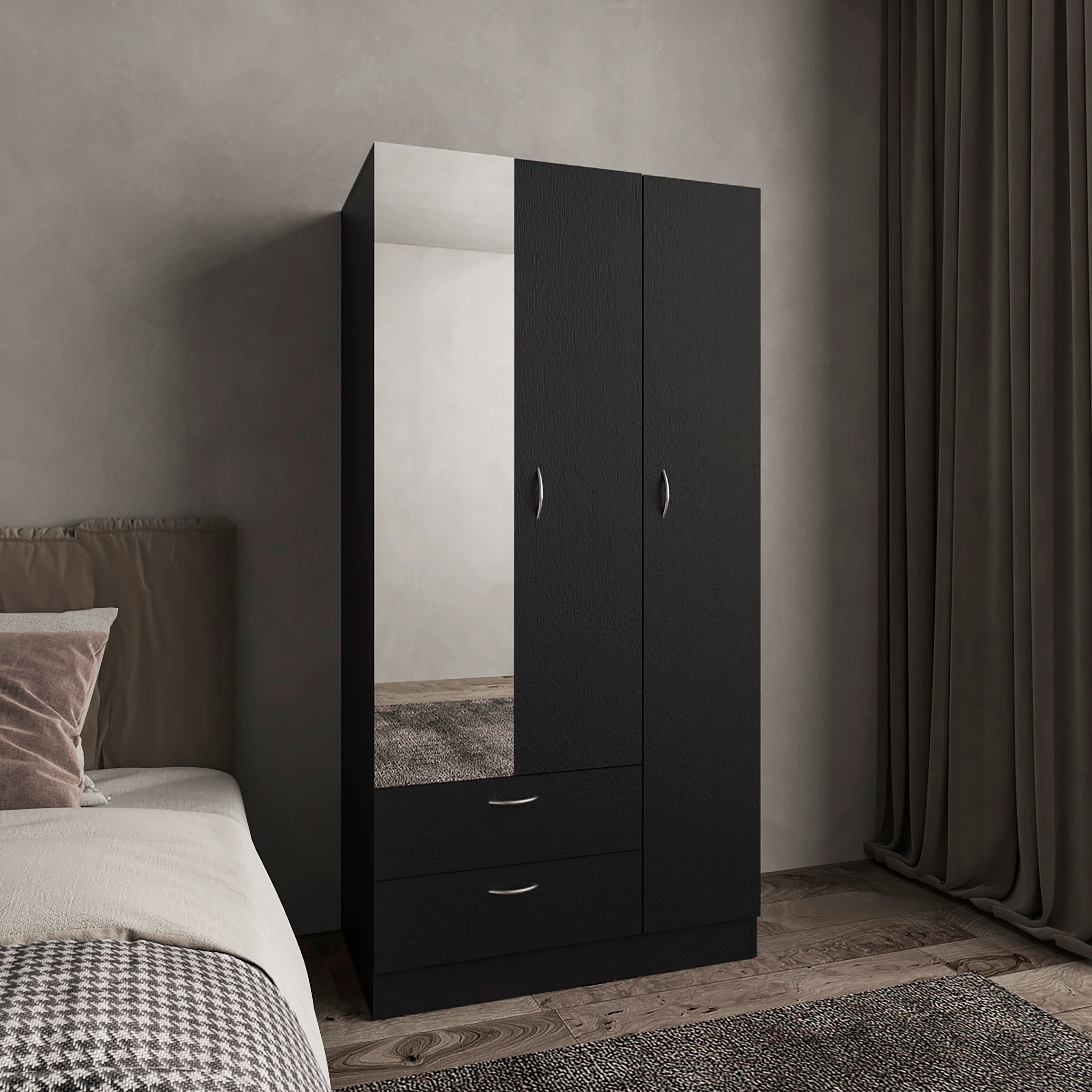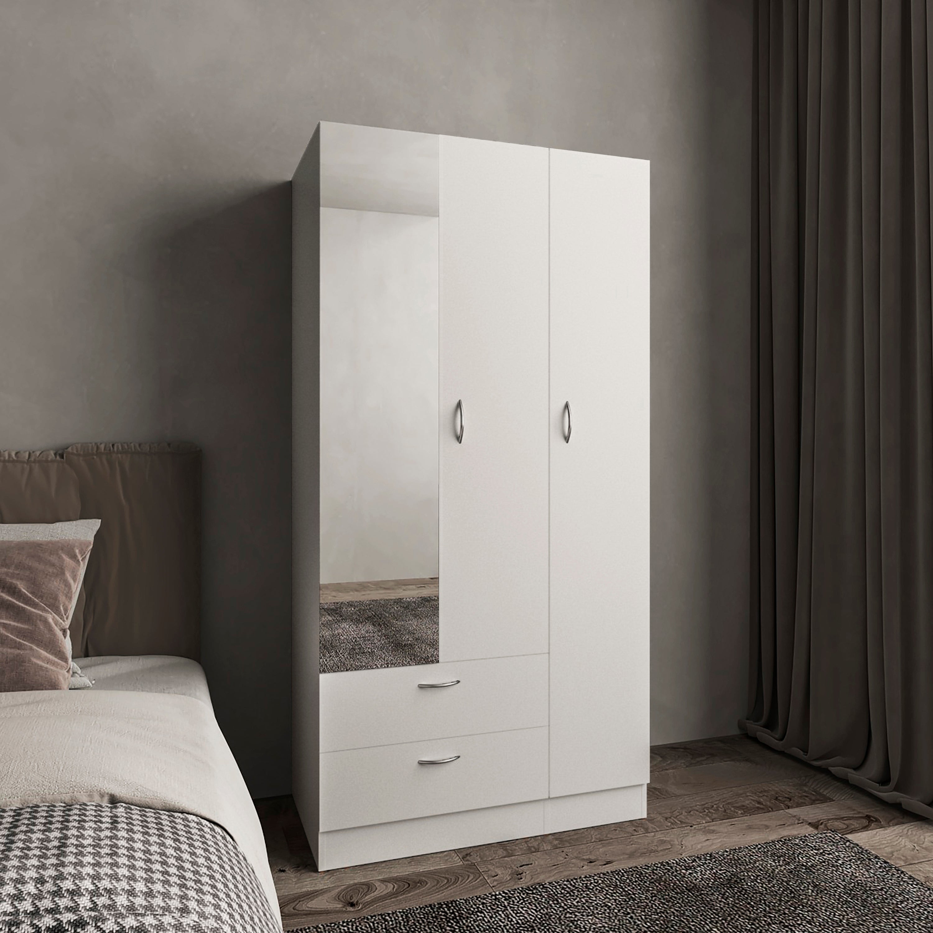 Riverside 3 door mirrored armoire with two drawers, four shelves, and hanging rod