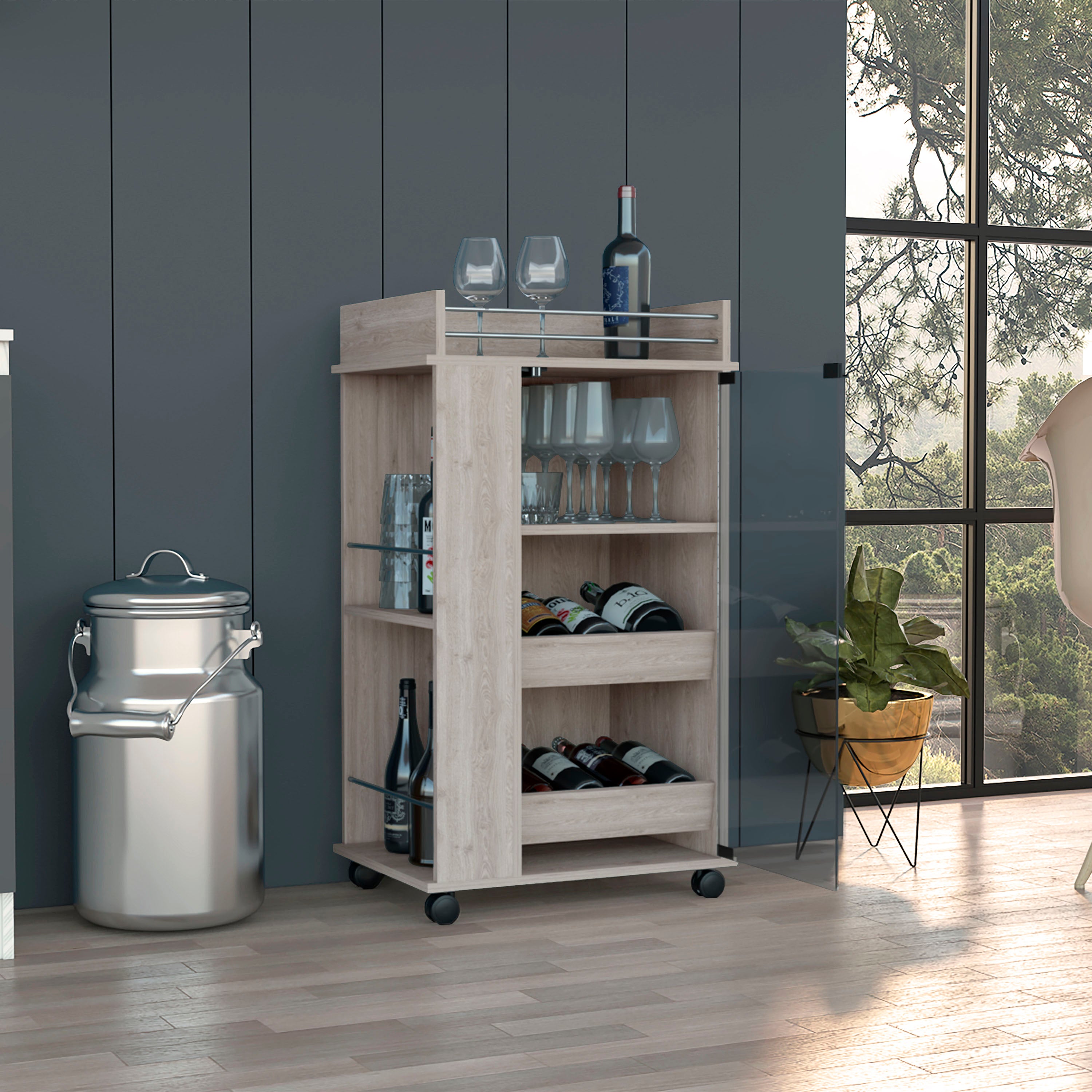 Bar cart, two external shelves, four casters, six wine cubbies, single door cabinet