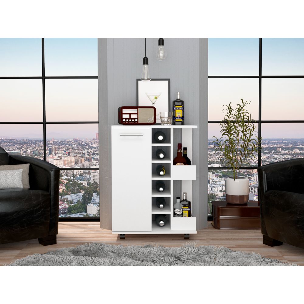 Bar cart, two external shelves, four casters, six wine cubbies, single door cabinet