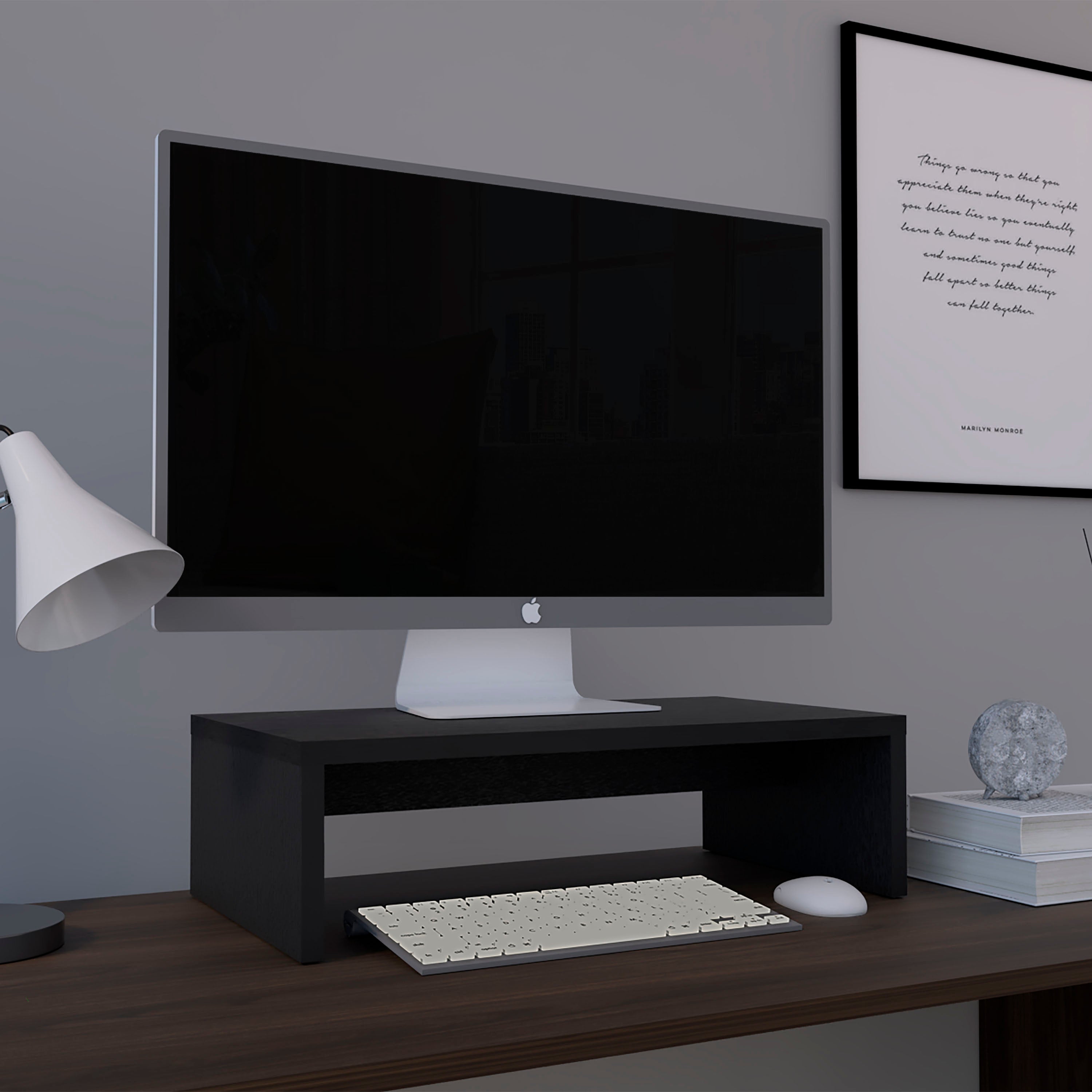 MONITOR STAND WITH HOLE DESIGN: Made of high-pressed particle board, and a scratch-resistant splash-resistant PCV laminate, this Monitor stand performs...