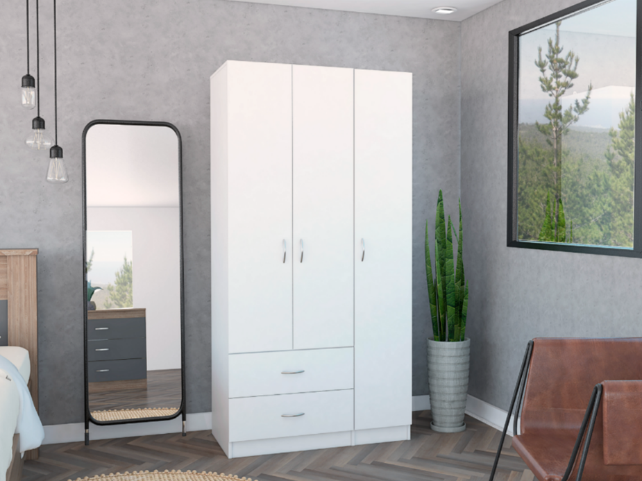 Tuhome austral three-door armoire with double door hanging cabinet, full-height shelving section, two spacious storage drawers, modern multi-compartment wardrobe for organized bedrooms and versatile home storage