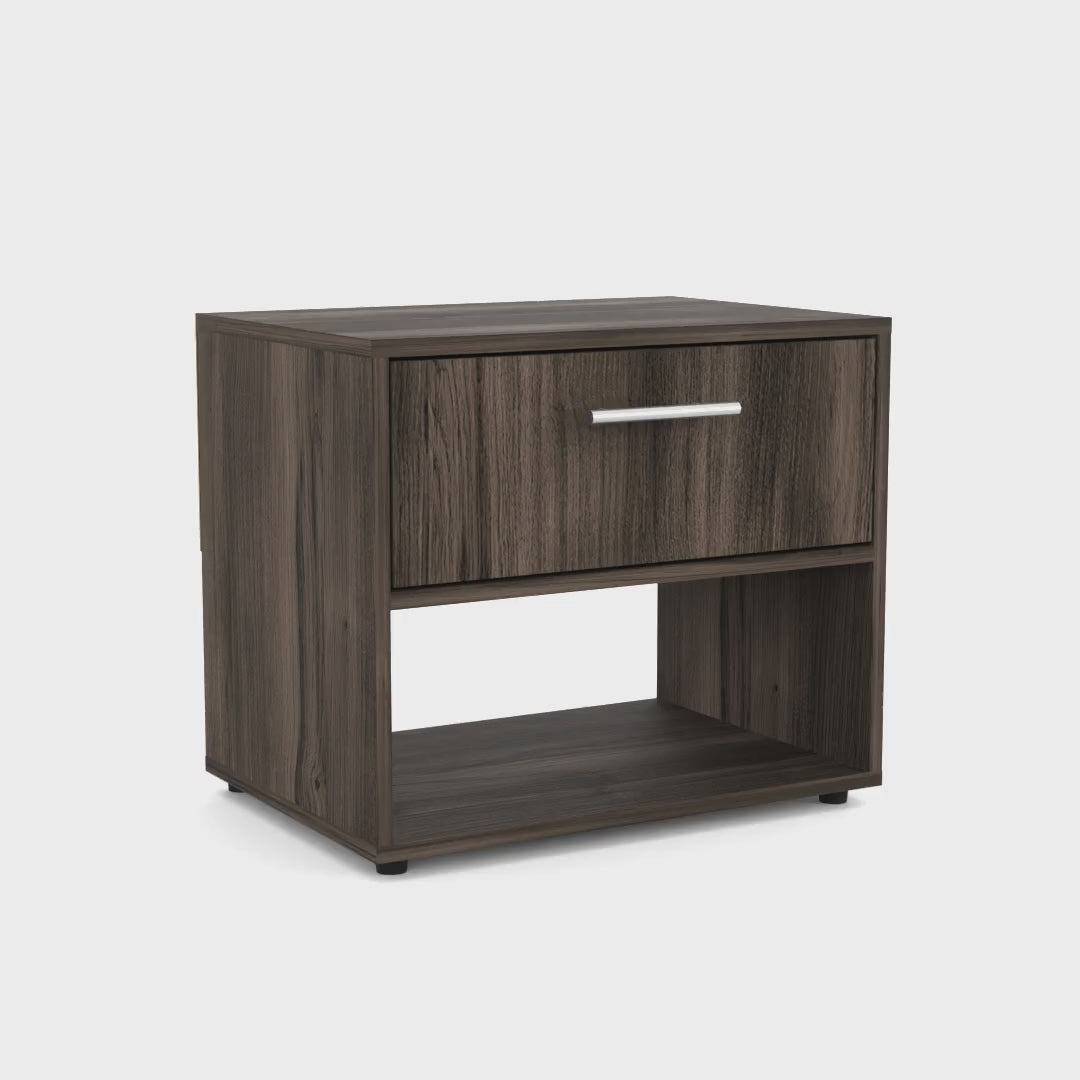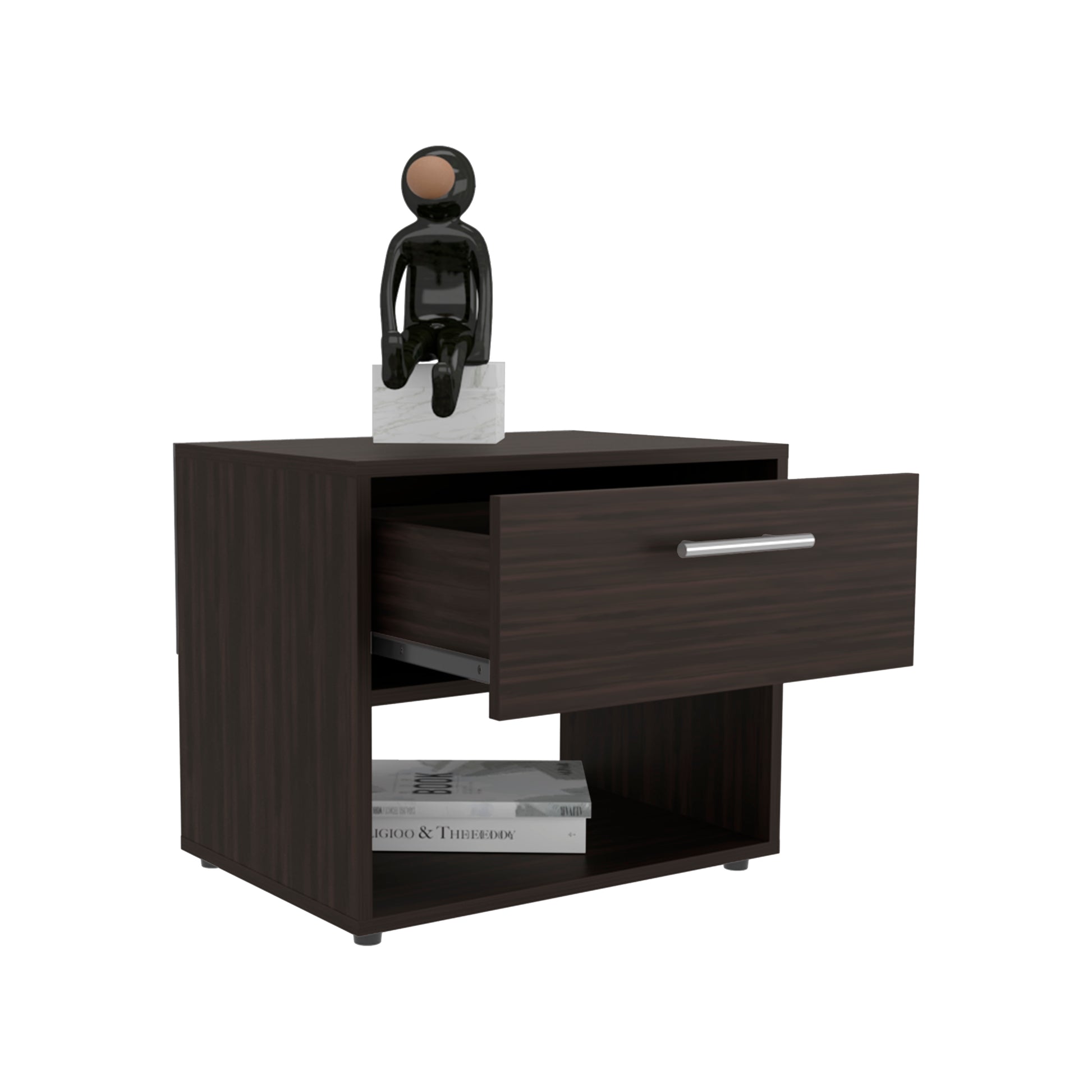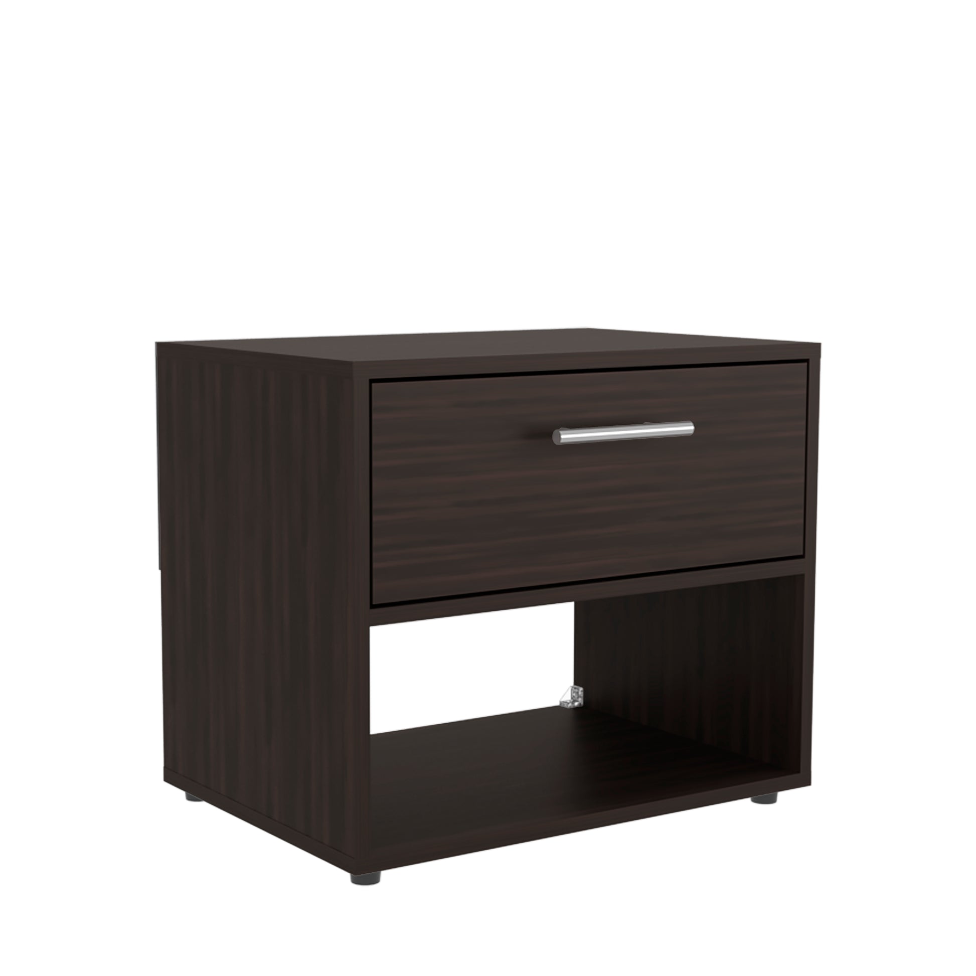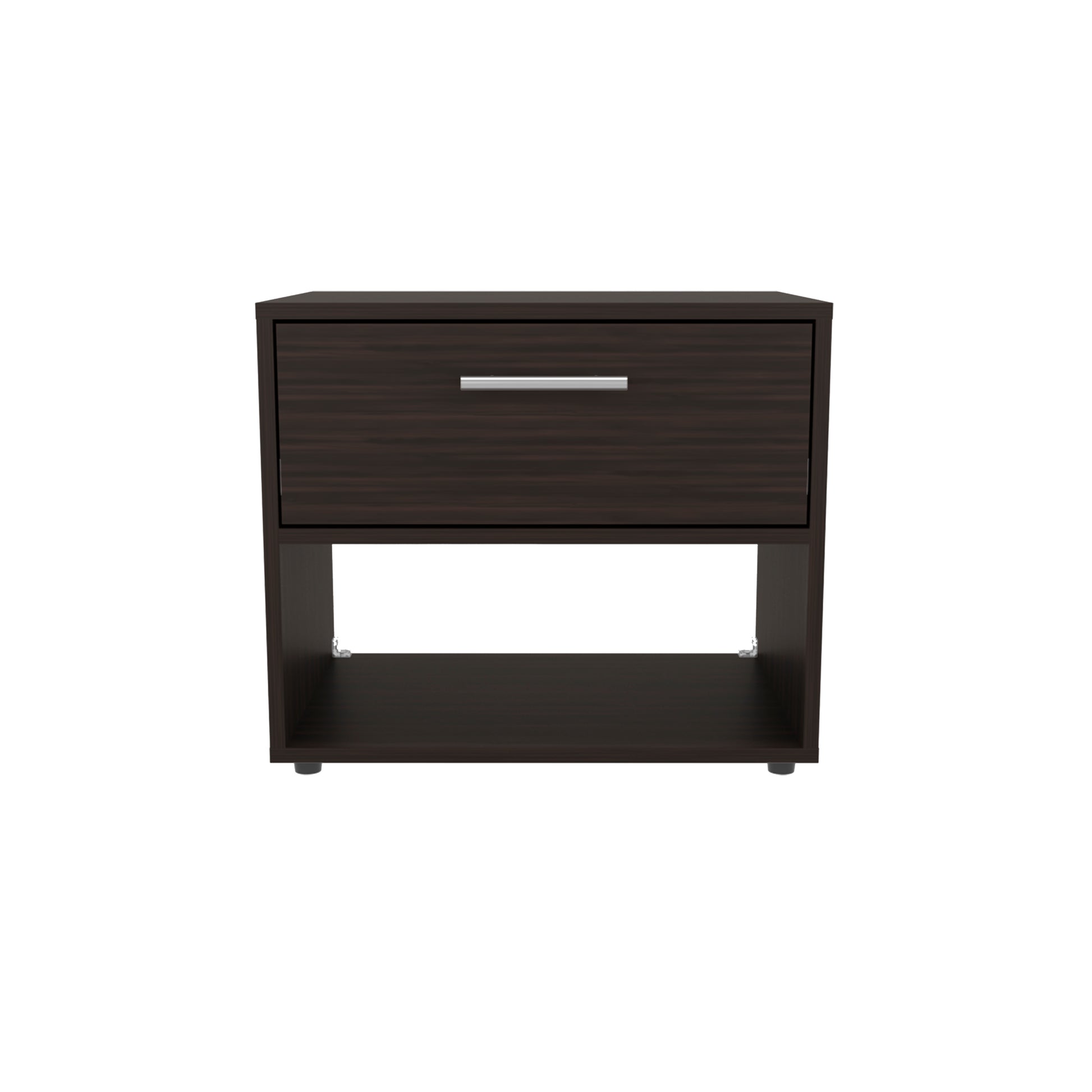 the Alpine 18" High One Drawer Nightstand with One Shelf, a chic and practical addition to any bedroom. Measuring 20" wide, this nightstand features a sleek and minimalist design, crafted from high-quality dark wood. Its compact size makes it perfect for small spaces while still providing ample storage. The nightstand includes one spacious drawer for keeping your essentials organized and out of sight, as well as an open shelf below for additional storage or display.