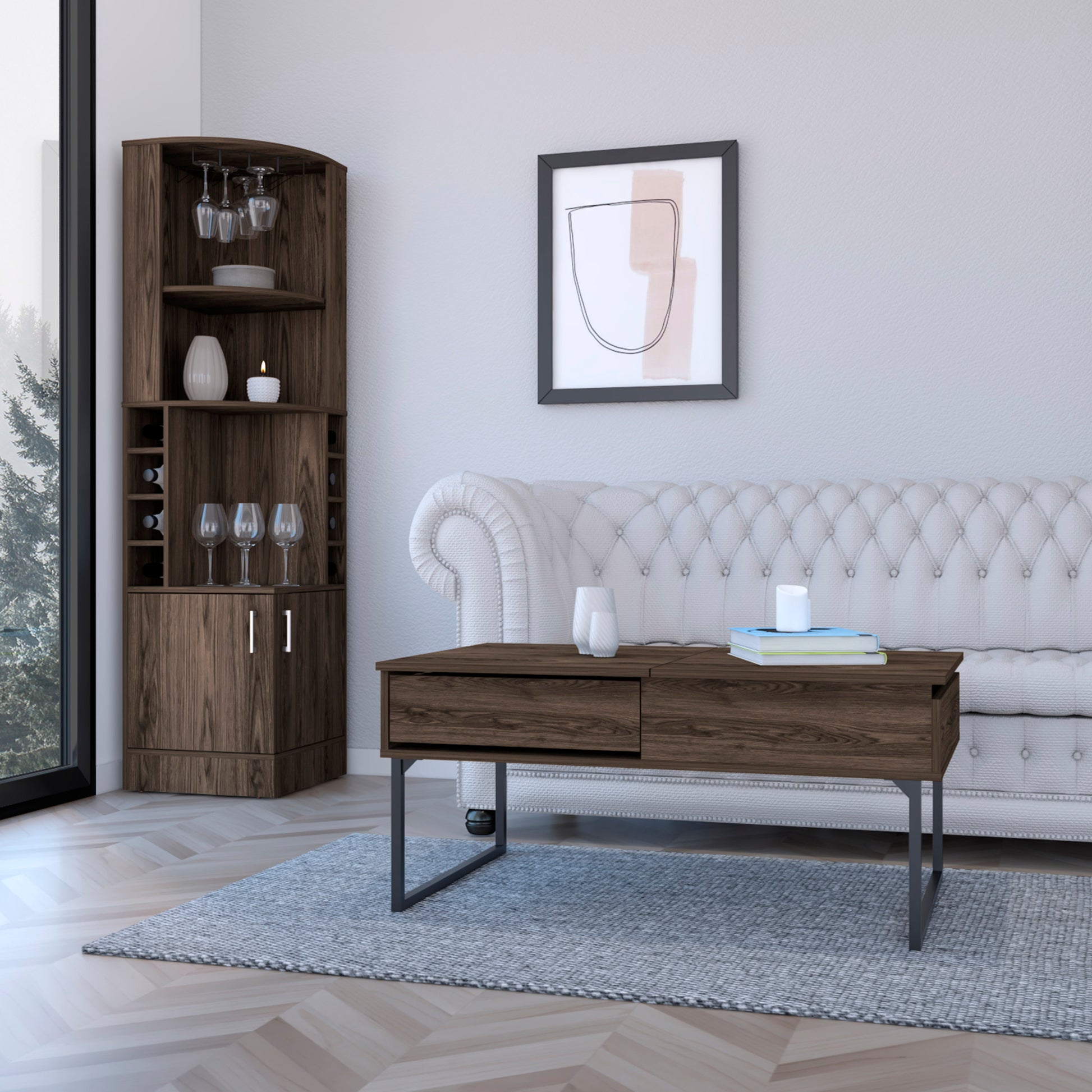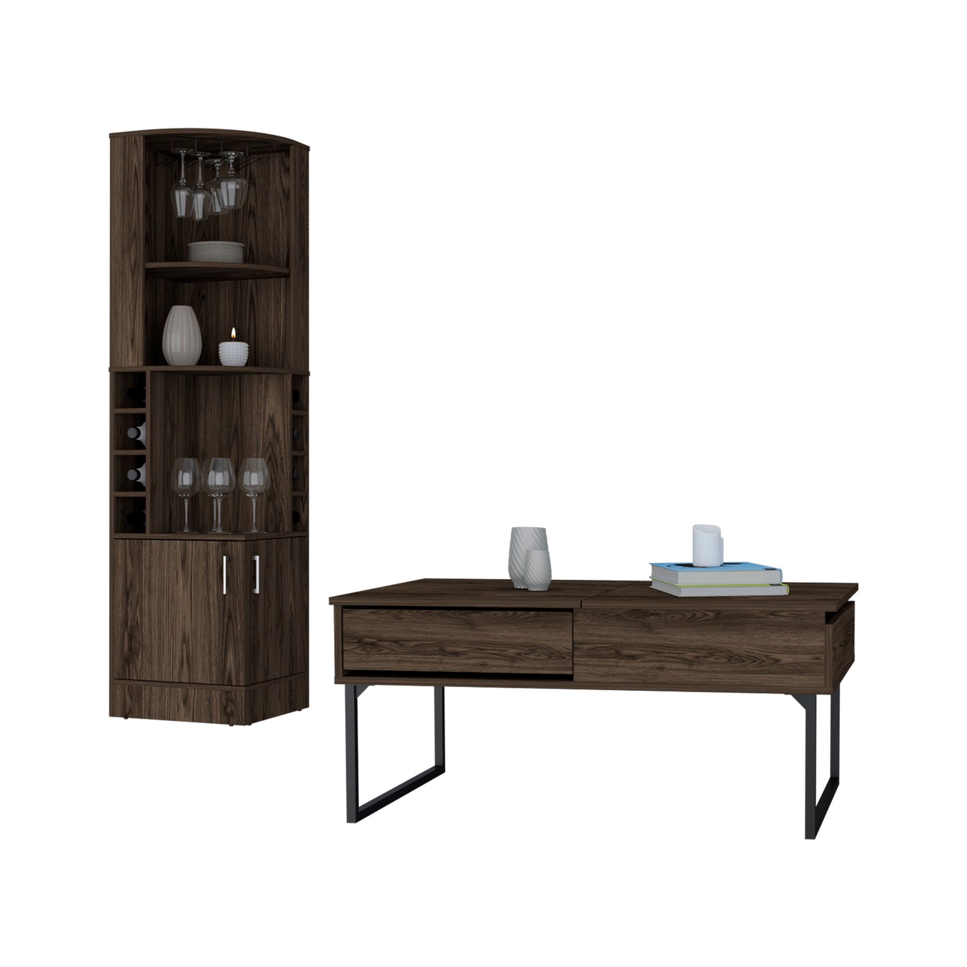 Bristol 2 Piece Living Room Set, Corner Bar Cabinet + Coffee Table, Dark Walnut Finish
