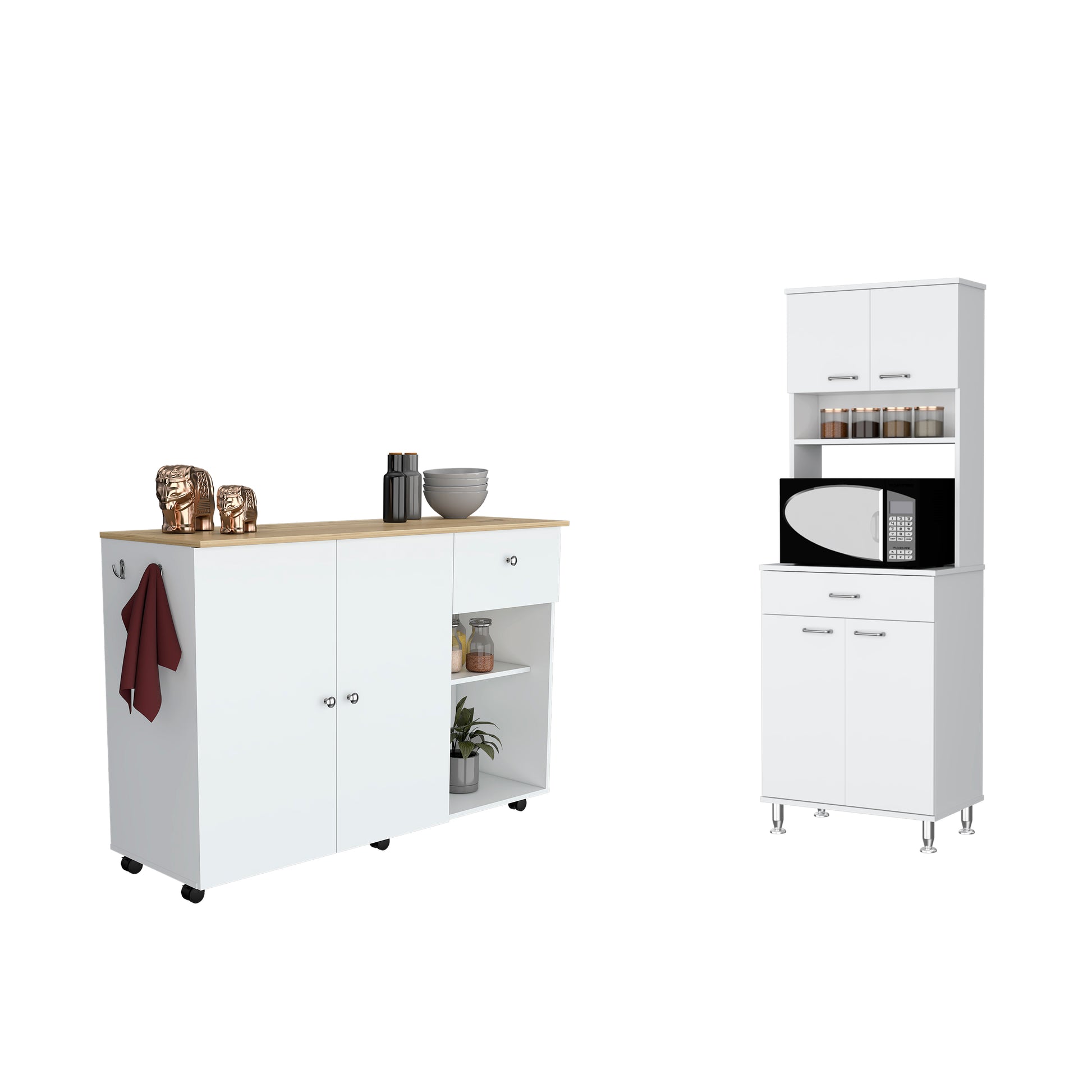 Campbell 2 Piece Kitchen Set, Kitchen Island + Pantry, White / Light Oak Finish