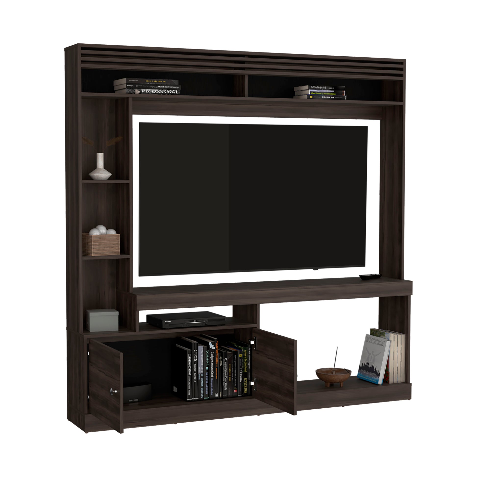 - Multiple Storage Options: Includes a large shelf under the TV, an additional open shelf, a two-door cabinet, and a larger open shelf at the bottom.