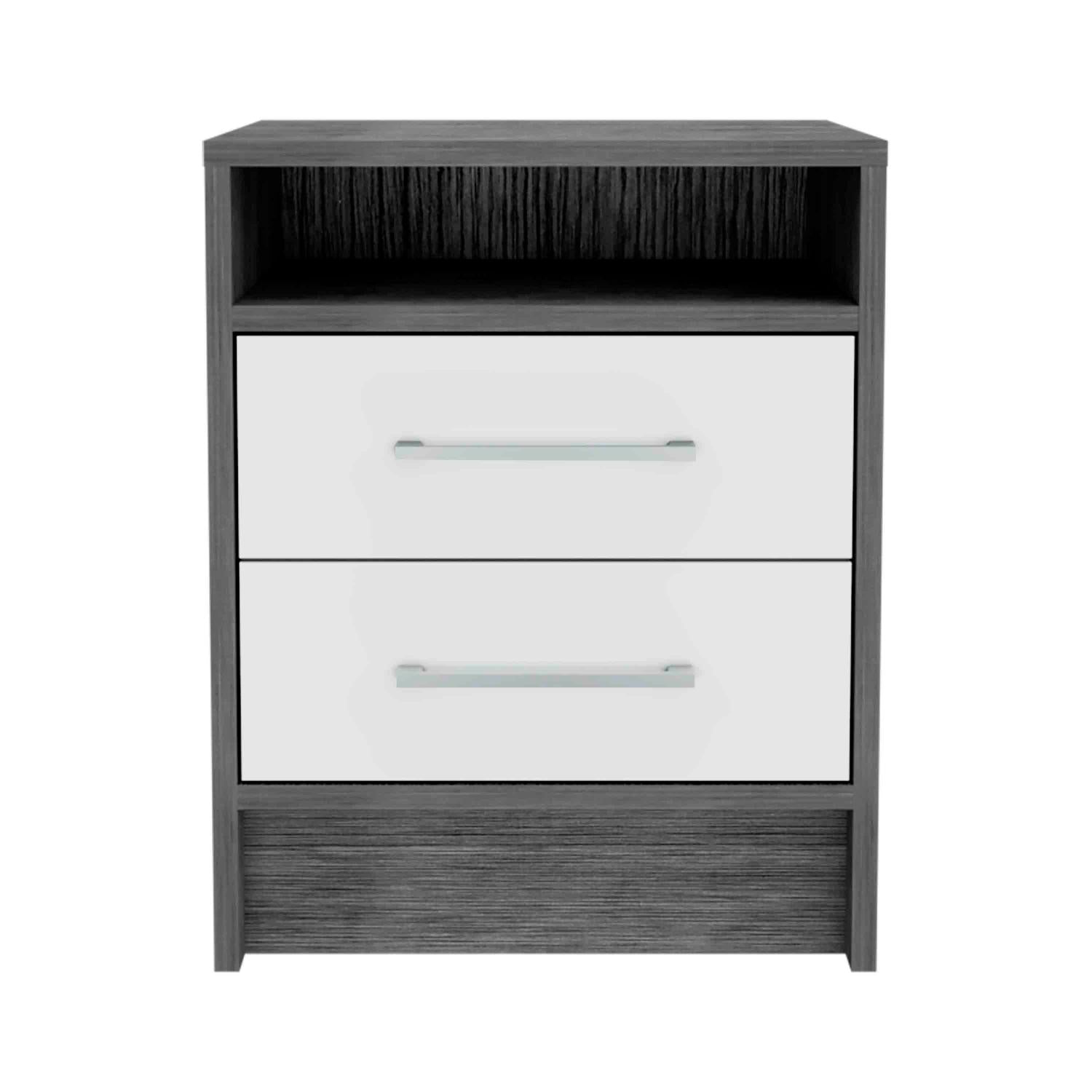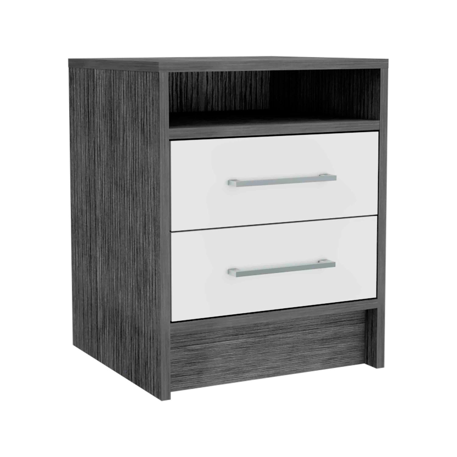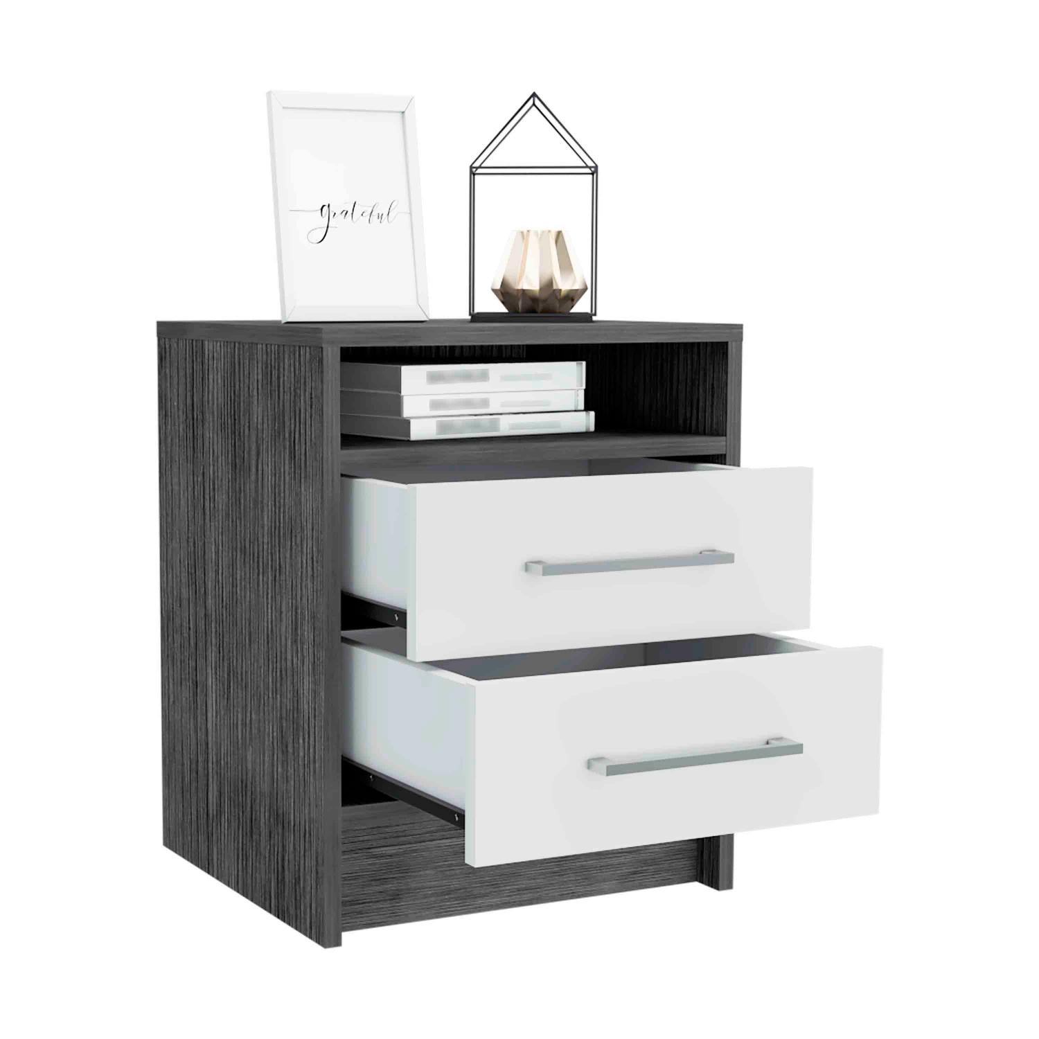 The Bianco Nightstand You'll love the look of this sleek and modern nightstand in your bedroom or living room. It has a fresh, contemporary design that will complement any décor. Designed with a unique touch of smoky oak-white particleboard finish, the Bianco Nightstand comes with two drawers ( 14,2''W X 5,1''H) for extra storage and safety with an open compartment for books or your mobile devices.