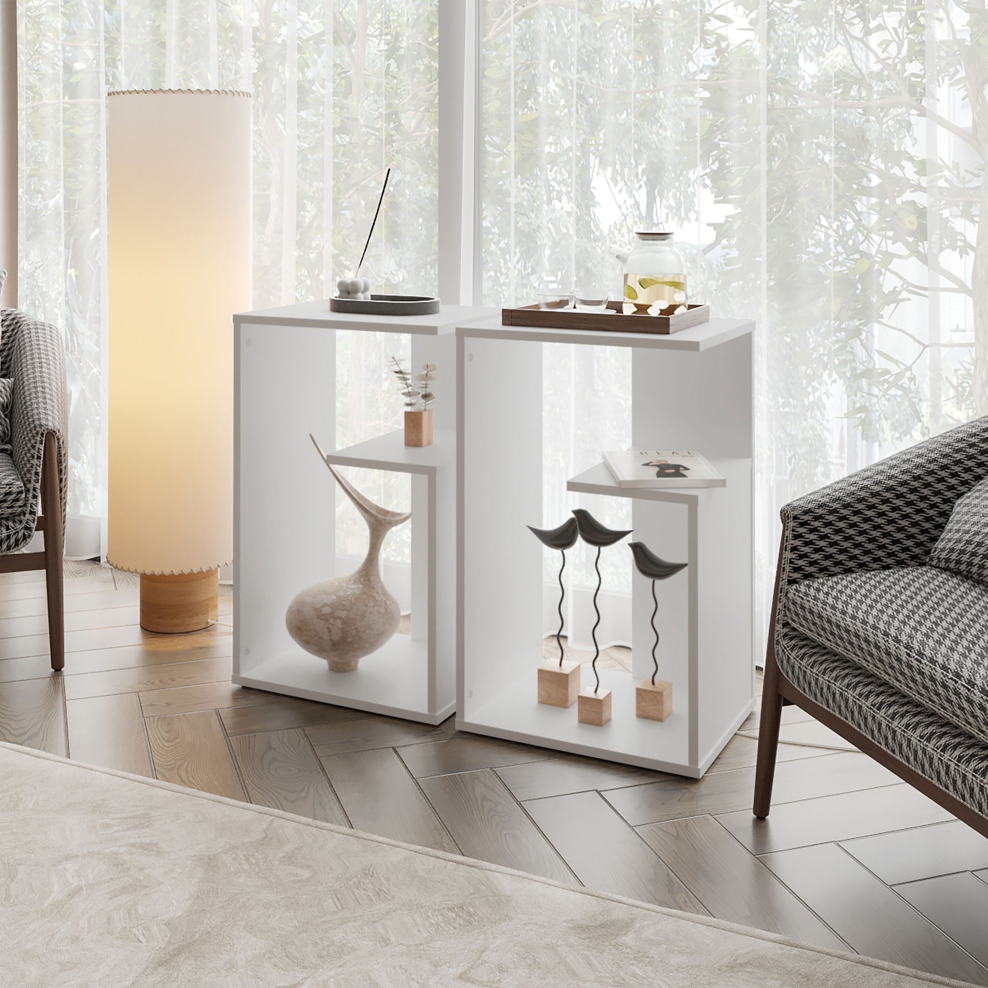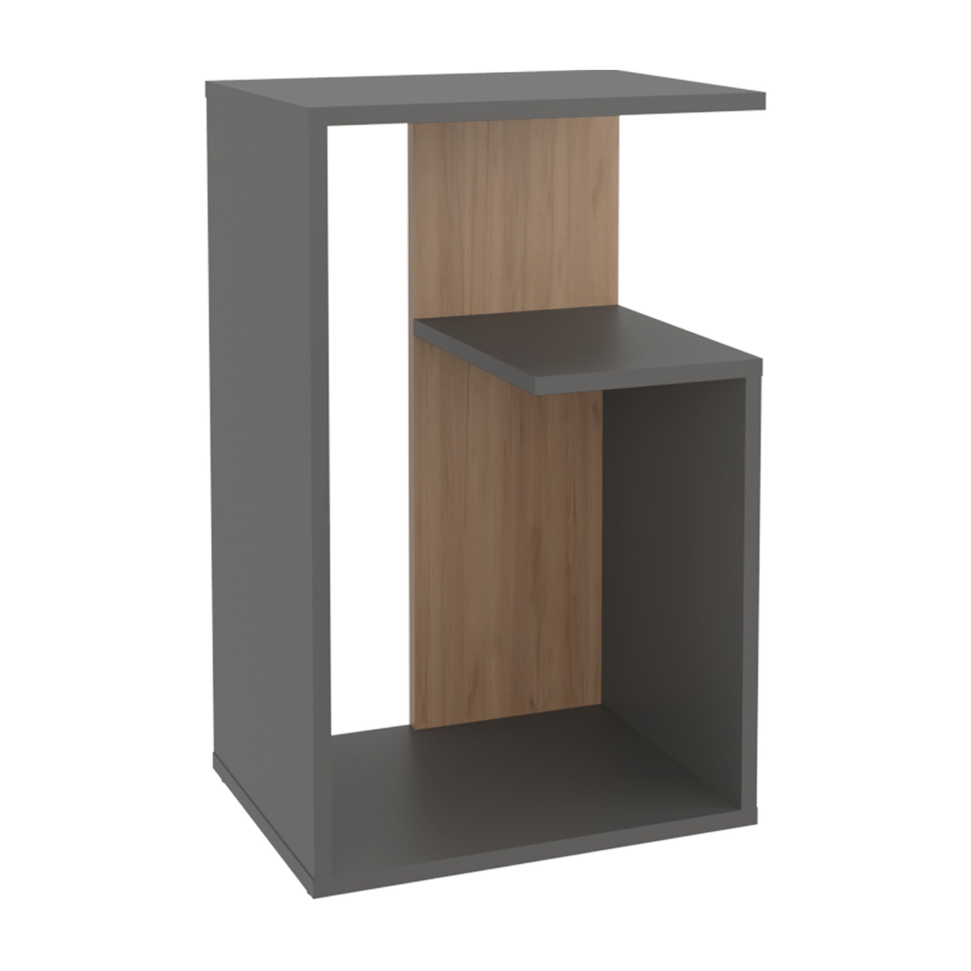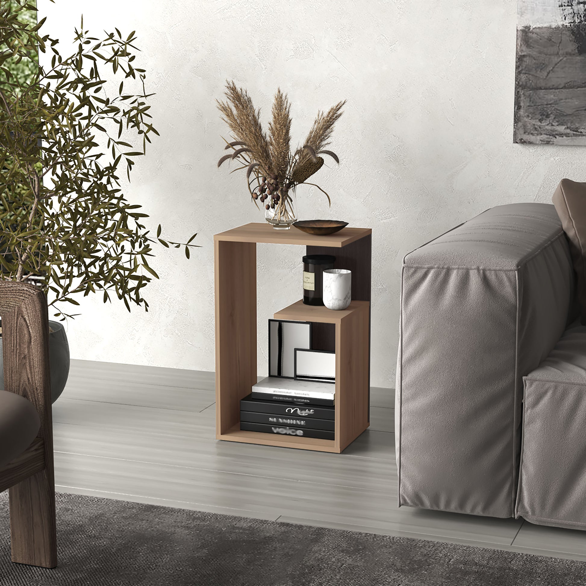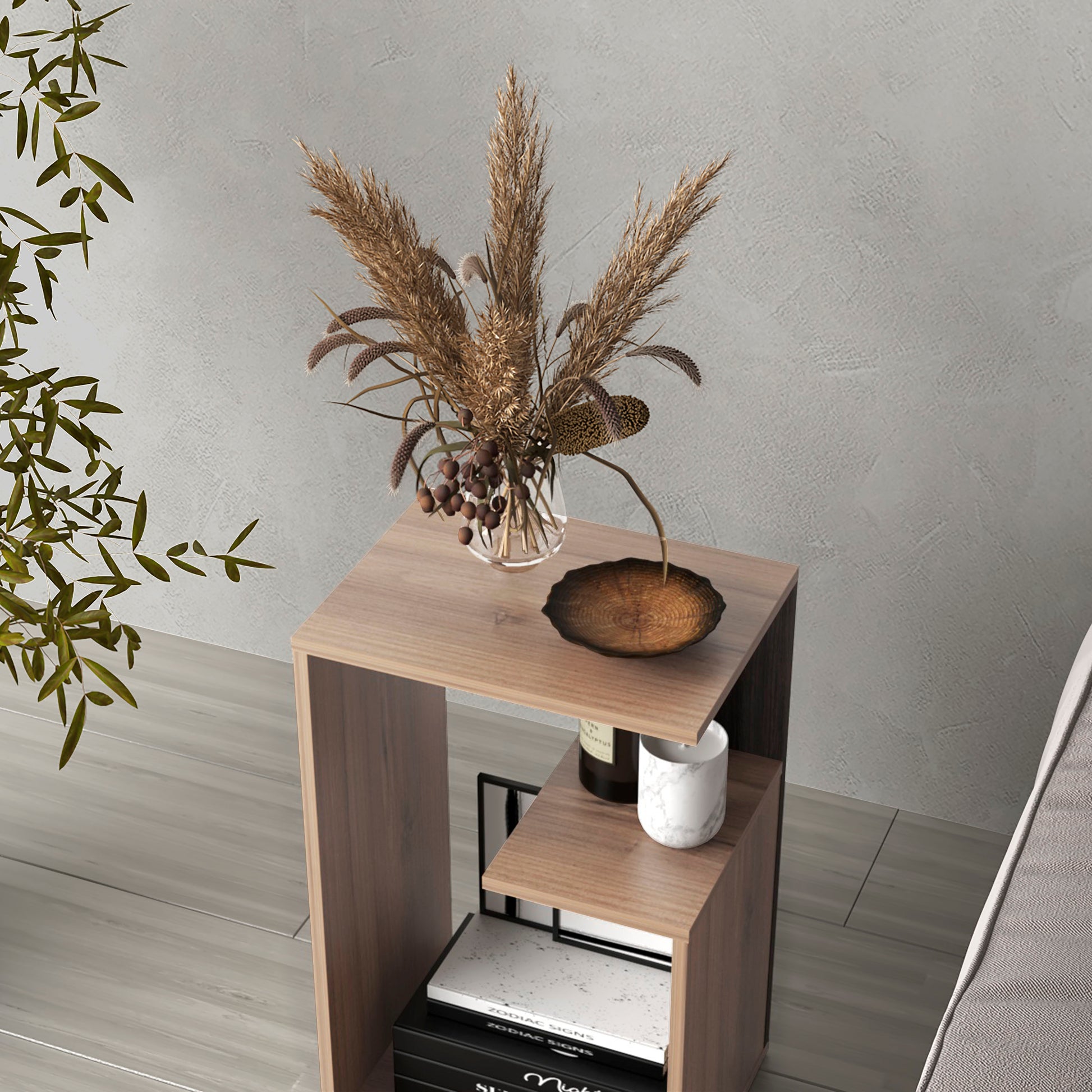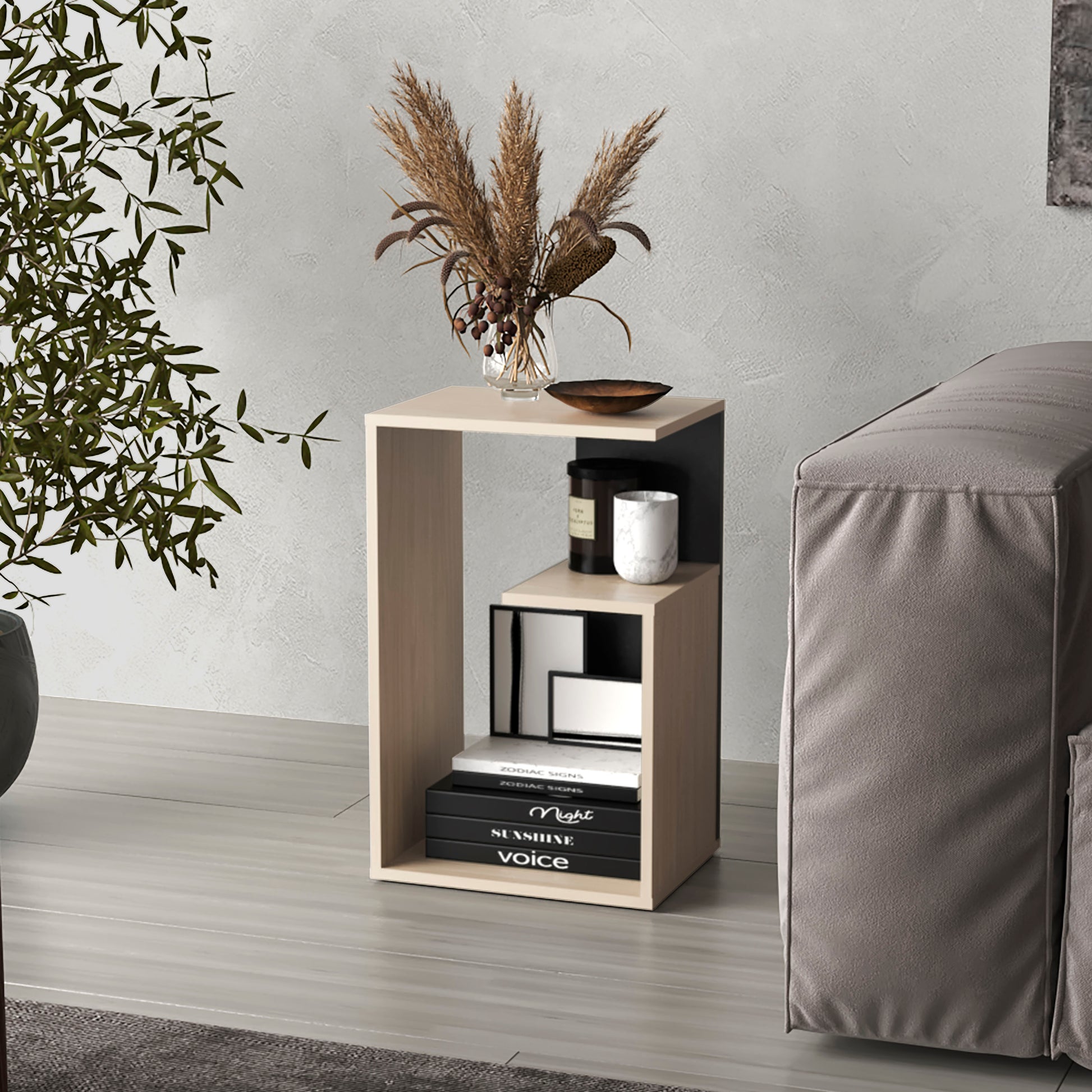 Elevate your living room with this sleek side table, designed to seamlessly blend beside your cozy couch or sofa. Crafted for compact spaces, this end piece offers practical storage without compromising on style. The small stature ensures it fits neatly into any room layout while providing ample surface space for your coffee cup or remote control on its tray-like top. Below, dual shelves offer convenient spots for magazines or decorative items, making it an indispensable stand in any modern home. Customers can buy two to create a matching set, enhancing the symmetry and functionality of their living space. This side table is perfect for those who appreciate both form and function, adding a touch of elegance to any room.