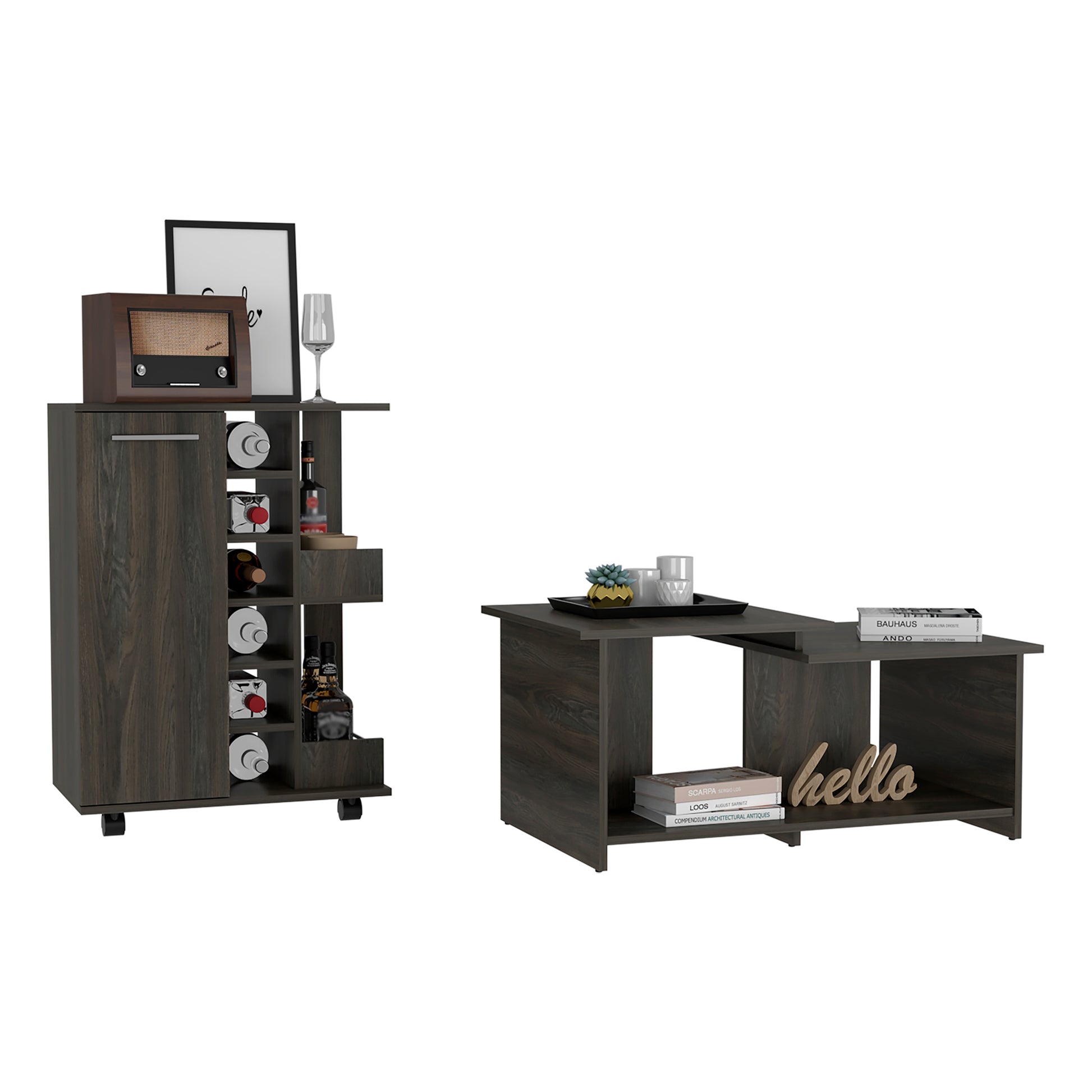 Irvine 2 Piece Living Room Set, Bar Cart + Coffee Table, Carbon Espresso Finish