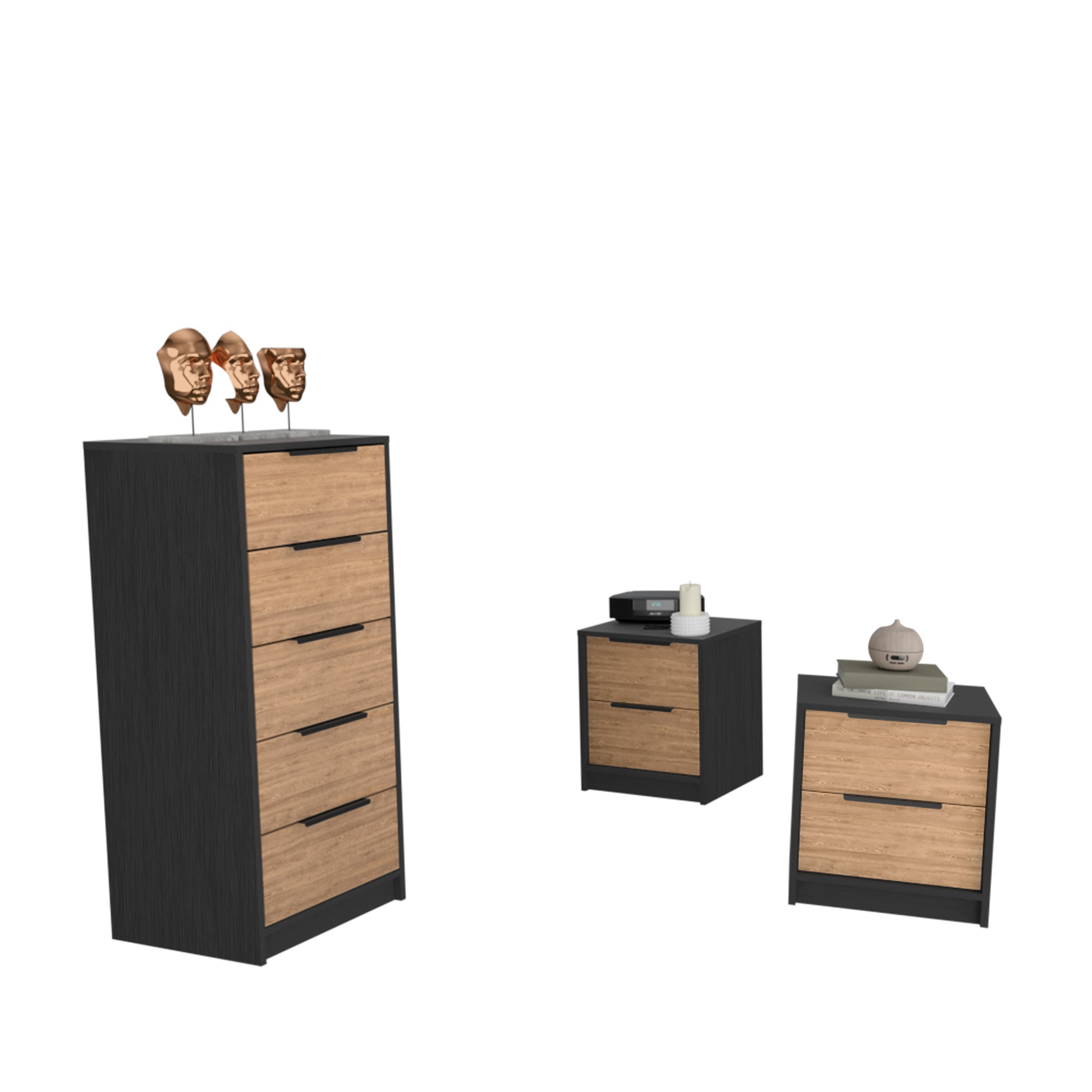 Kaia 3 Piece Bedroom Set, Dresser + Nightstand + Nightstand, BlackWengue / Pine Finish