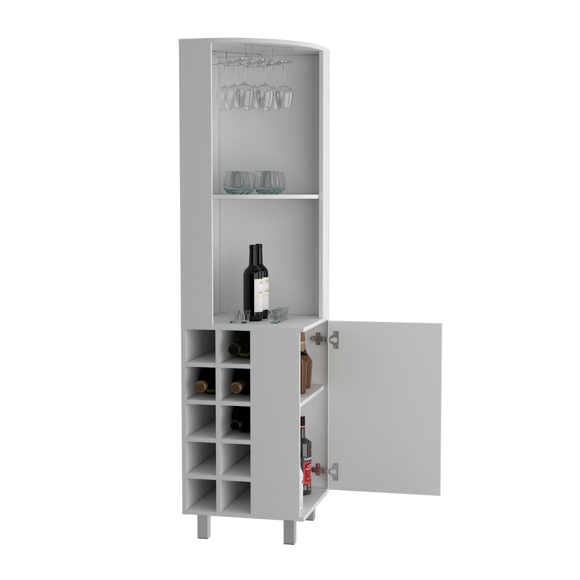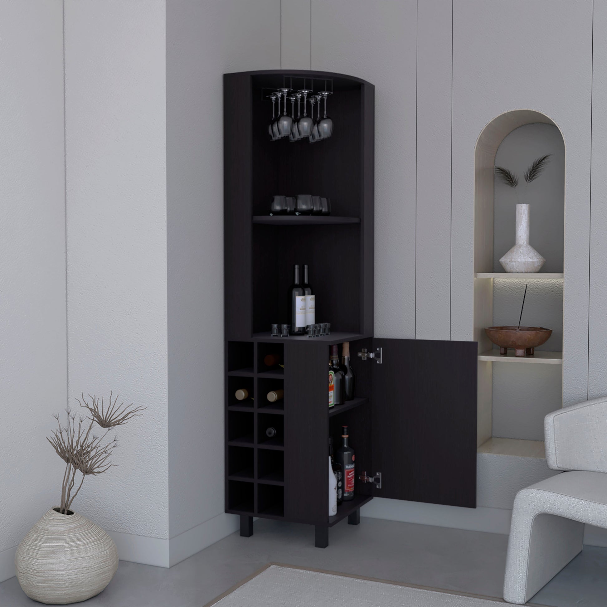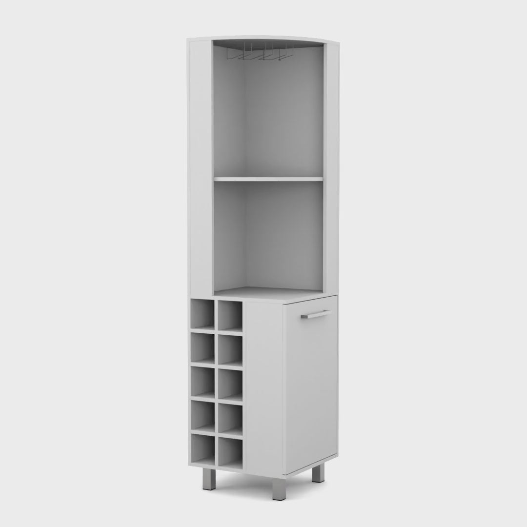 Kaia Corner Bar Cabinet with superior Glasses shelves and Cubby Shelving