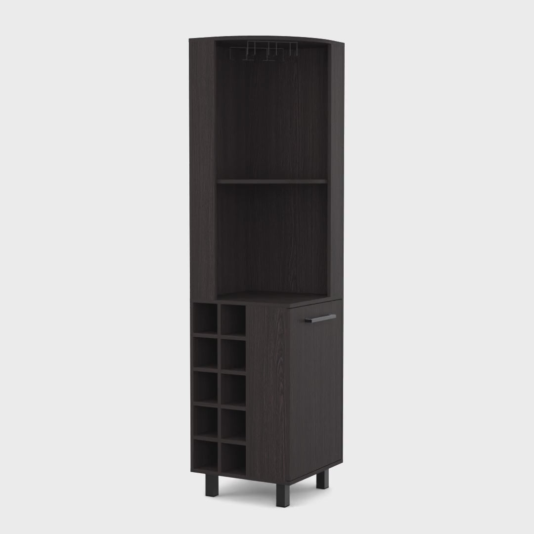 Kaia Corner Bar is the perfect addition to any wine lover's home. This stylish and functional bar includes ten wine cubbies (4,4''W X 4,7''H), one cup rack especially for your glasses, two interior shelves (10''H X 15,3''H) and two superior shelves (20,8''H X 17,7''H X 16,4''W). Whether you're looking for a place to store your wine or a place to entertain guests, the Kaia Corner Bar is sure to satisfy you. Designed with elegant black wengue-pine manufactured wood finish.