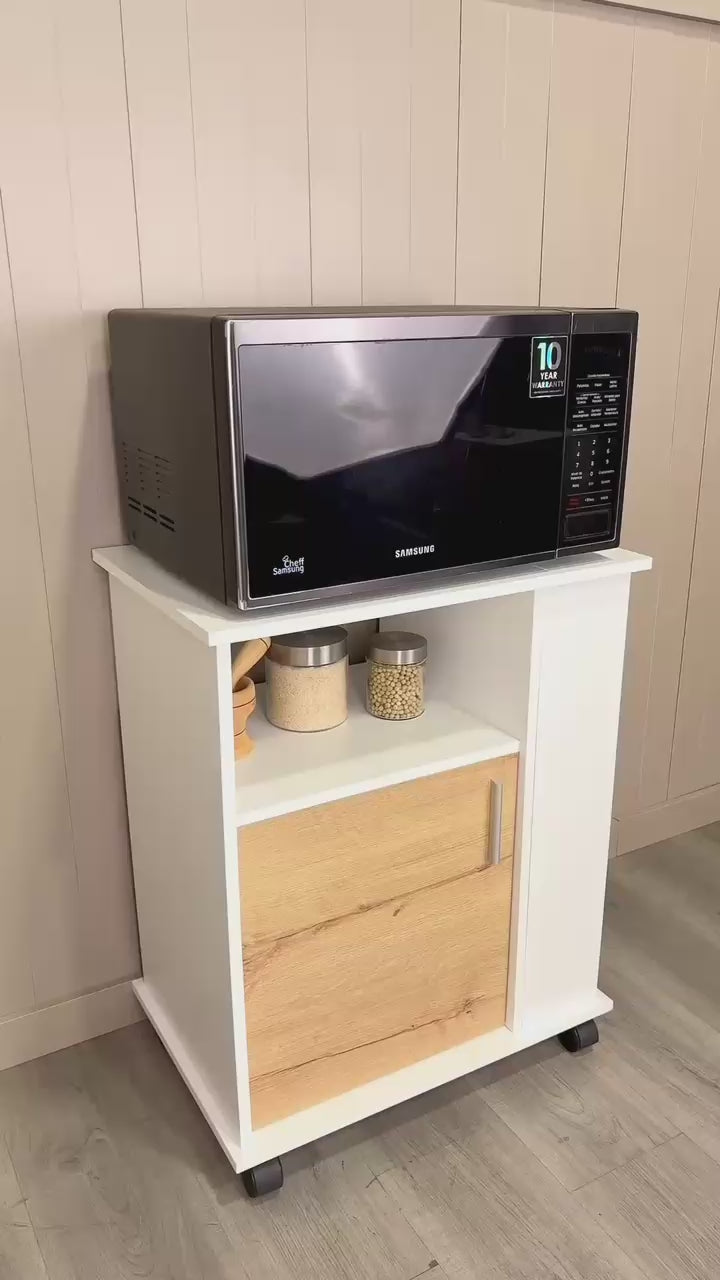 The Tuhome Kitchen Pantry Cart is the most useful addition you can possibly get for your home. This cart features two spice racks, an open shelf on the side and the middle of the cart perfect for placing fruits and vegetables. A cabinet for larger items like pots and pans. The lockable wheels allow practical and easy mobility and the top is perfect for microwaves or any other large items. The modern white finish will open up any kitchen space.