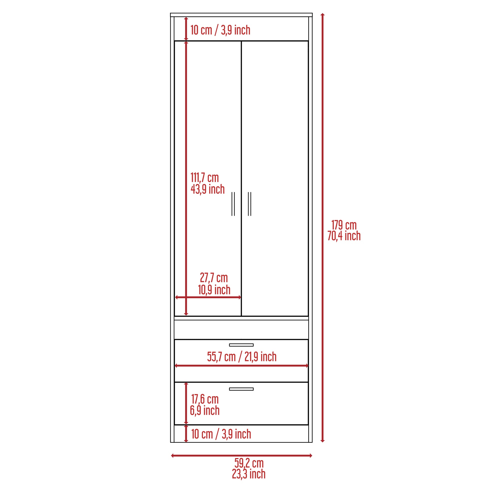 Simone Armoire, part of an exclusive collection with beautiful design and spacious, the Simone Collection Armoire features Double Doors (10,9''W X 43,9''H) and two spacious drawers(21,9''W X 6,9''H). A covered hanging rod will help you store anything you need. It's an ideal fit for your bedroom, garage, living room, or kitchen of its ergonomic size (23,31''W X 18,89' D X 70,47''H). It is the perfect solution for extra storage in limited-space rooms.