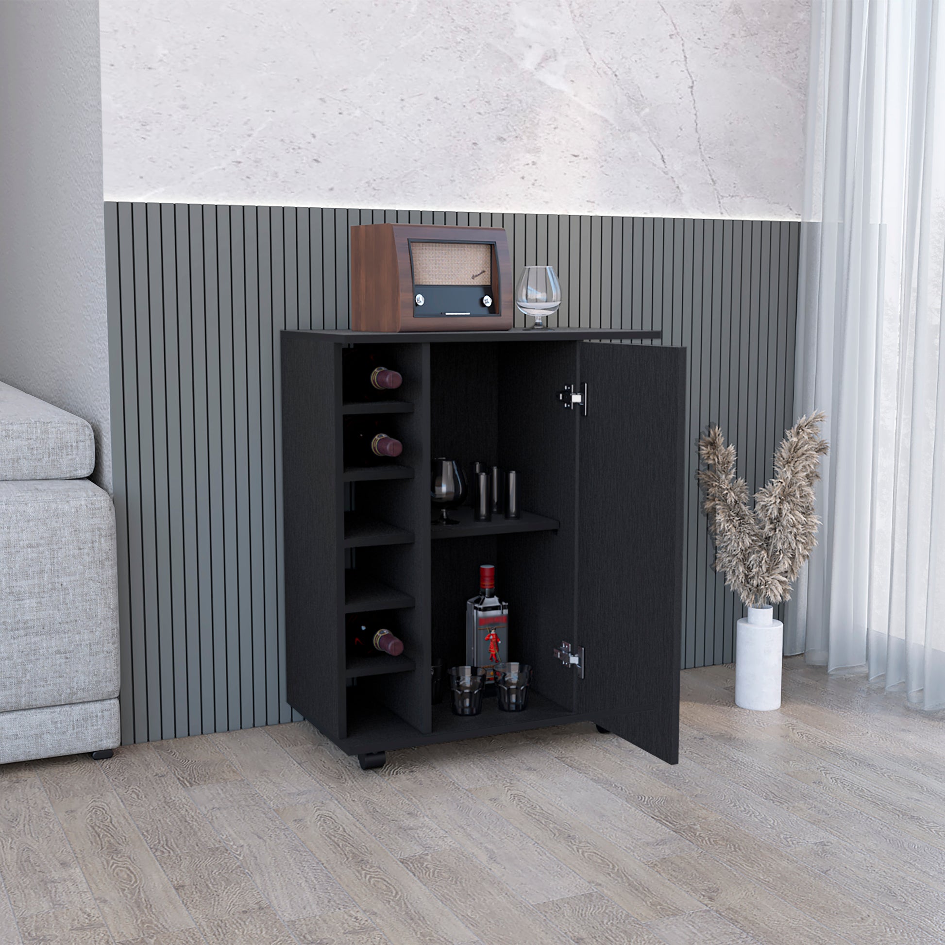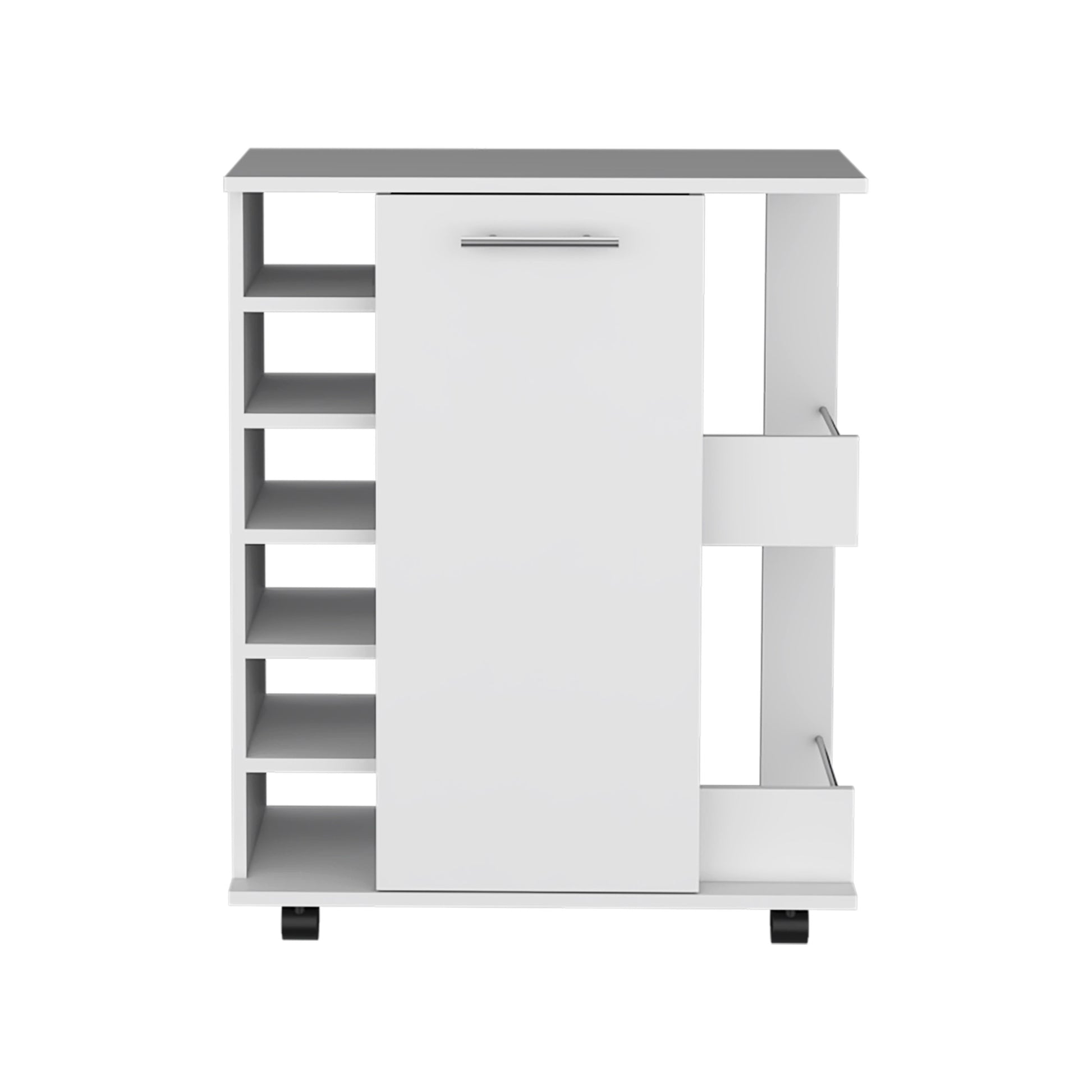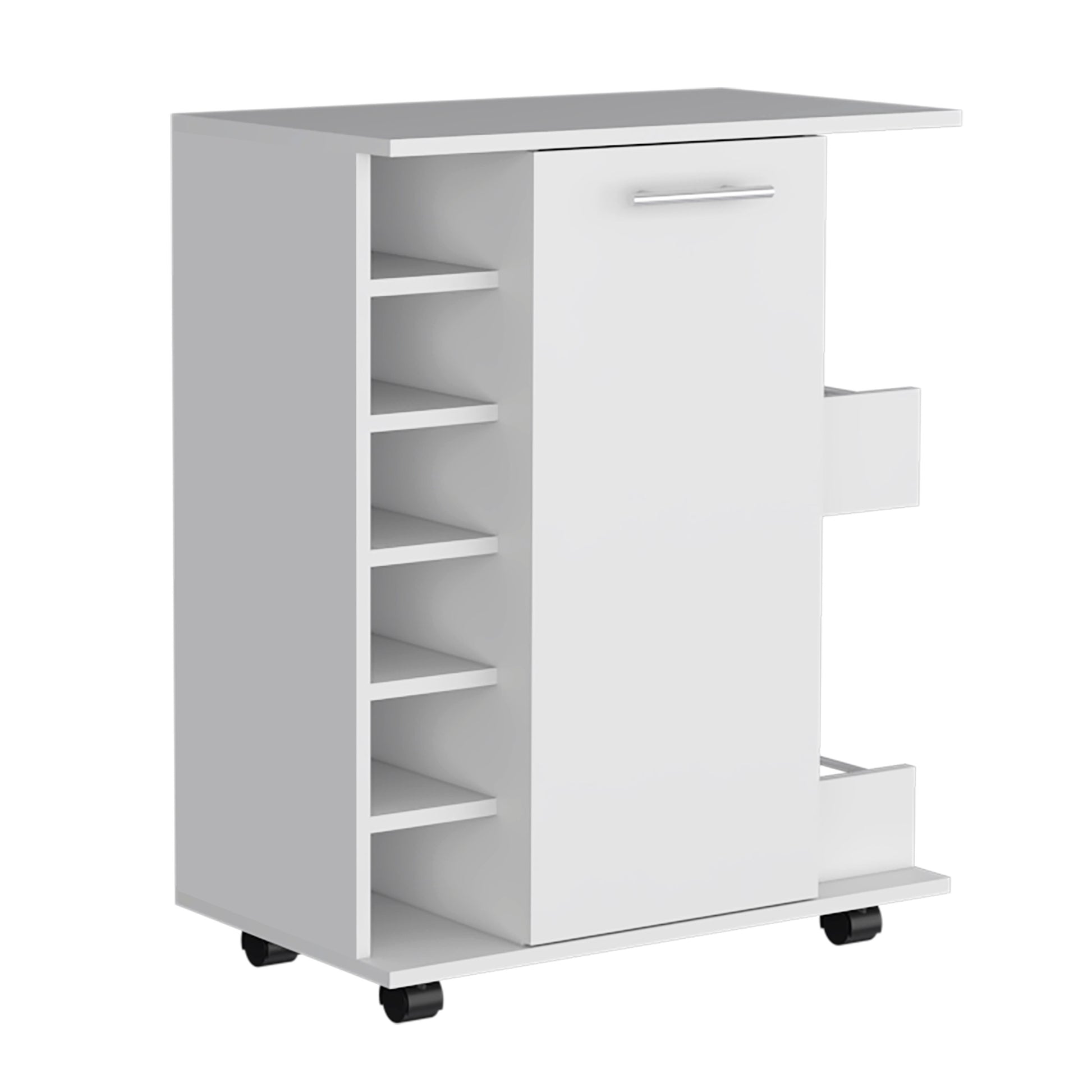 Bring elegance and functionality to your next gathering with the Lothian Bar Cart! Meet the Lothian Bar Cart: a chic and versatile mobile entertainment station that elevates your hosting game. Designed with resistant and durable manufactured wood, this modern cart is available in sophisticated white or black finishes. Effortlessly glide the cart from room to room on its smooth-rolling casters, ensuring your beverages and accessories are always within reach. The single-door cabinet offers hidden storage for bar tools and glassware, while the two side storage shelves (14.1" H x 14.7" D) provide space for displaying your favorite spirits and mixers. A built-in 6-wine bottle rack keeps your vino collection stylishly organized.