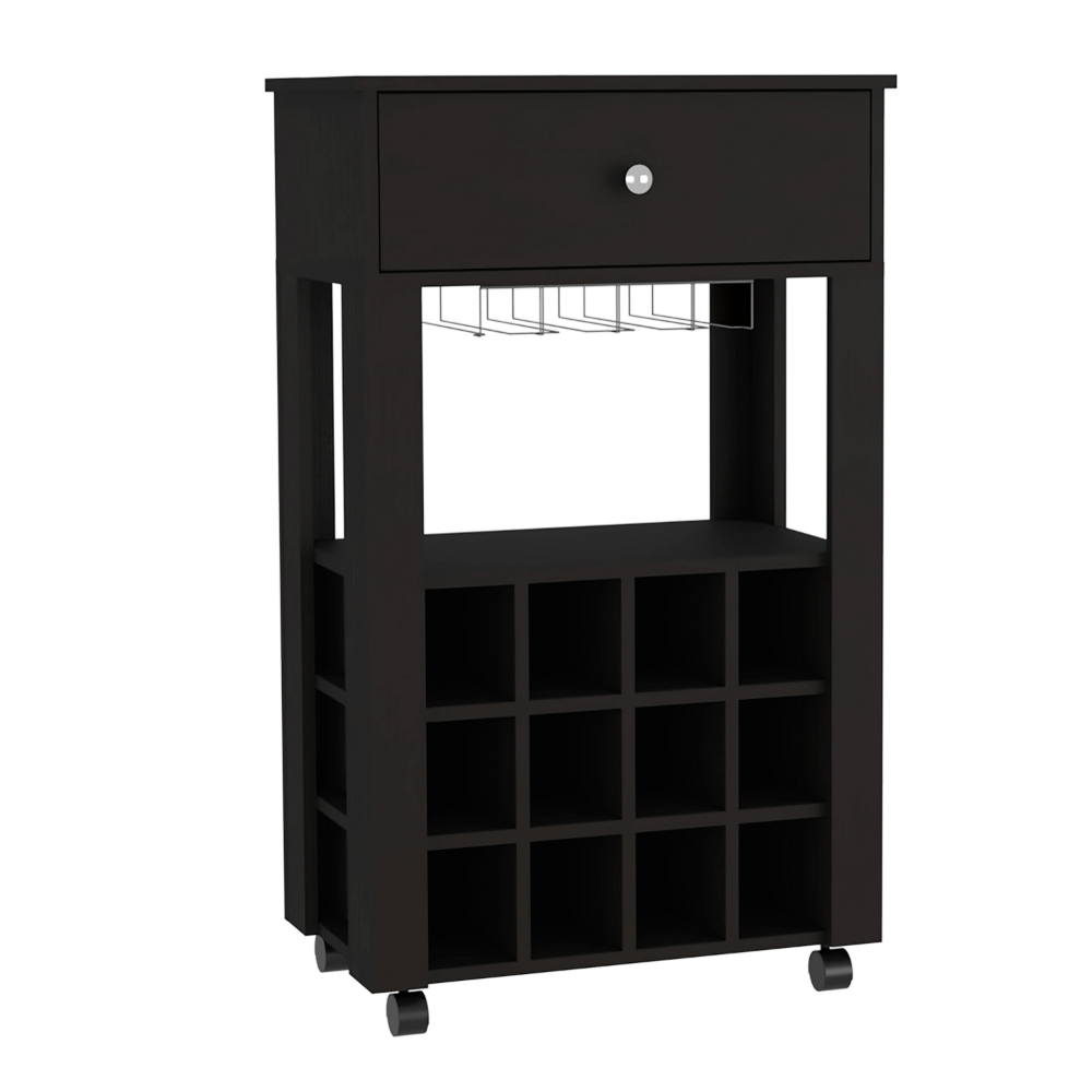 With a large storage capacity, it has twelve cubbies (4''W X 4,7''H) to keep your wine organized and fresh, in addition to having the ability to store your glasses, with a large drawer and caster wheels (2,2'') to improve its mobility and adapt it as you want.