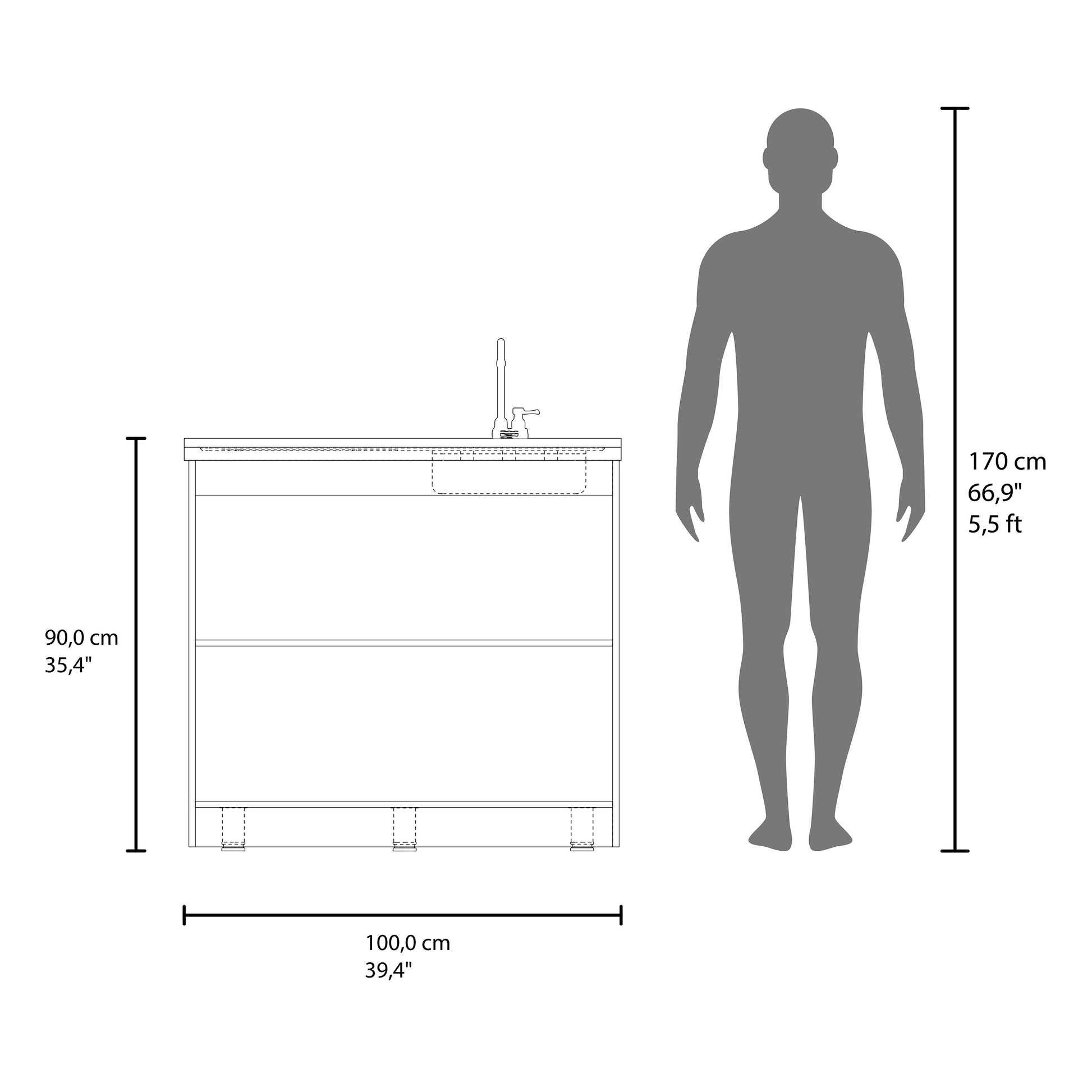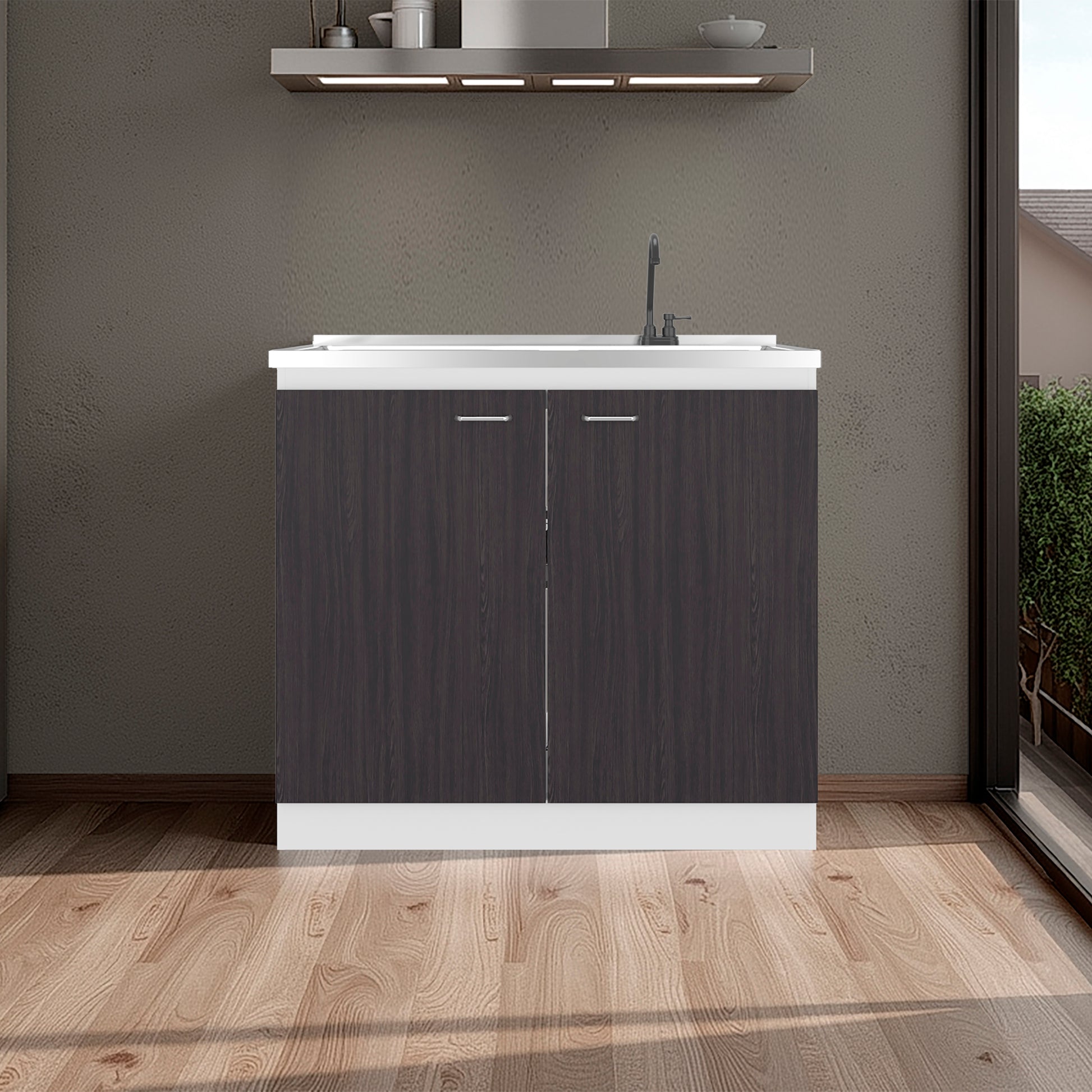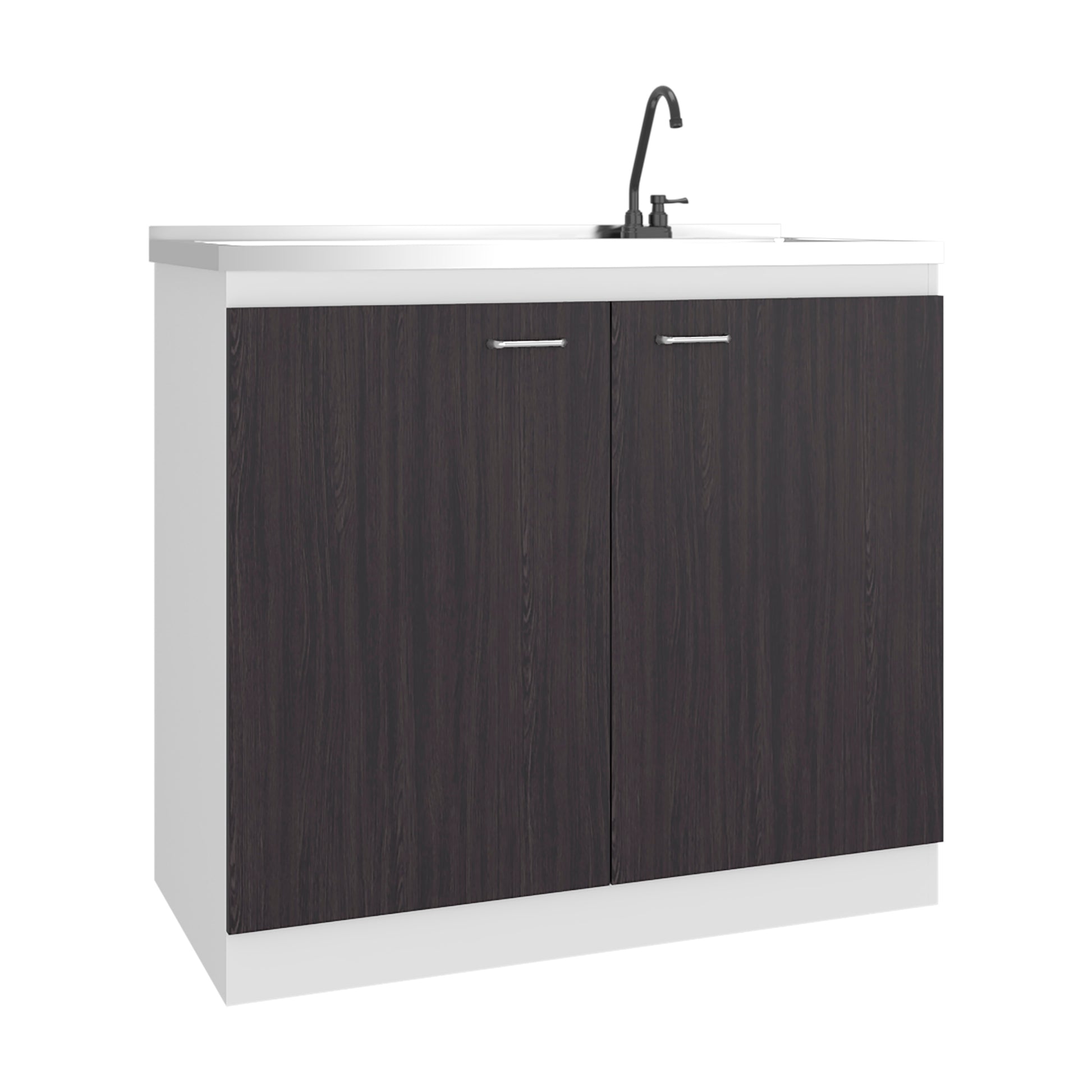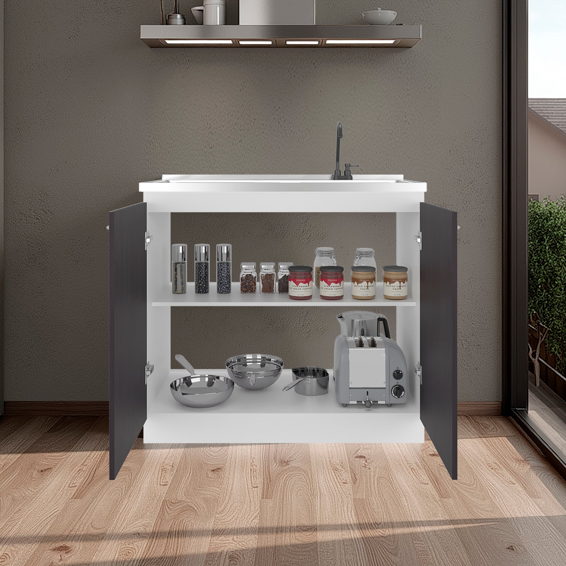 Napoles Utility Sink with Faucet Inclued and Integrated Steel Counter top and Basin, Freestanding cabinet with two doors, Metal Handles and Two interior shelves.