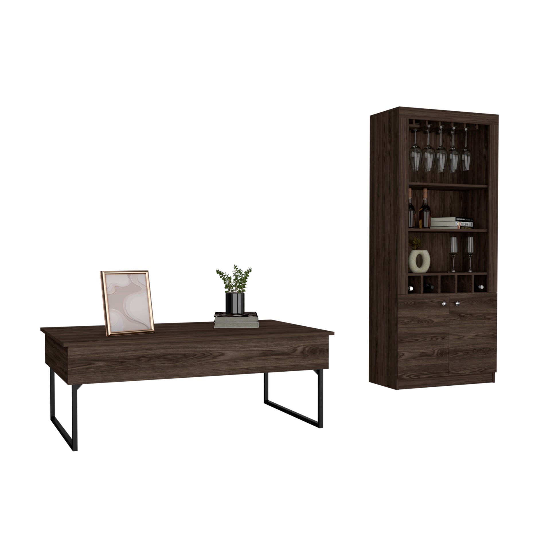 Palermo 2 Piece Living Room Set, Bar Cabinet + Coffee Table, Dark Walnut Finish