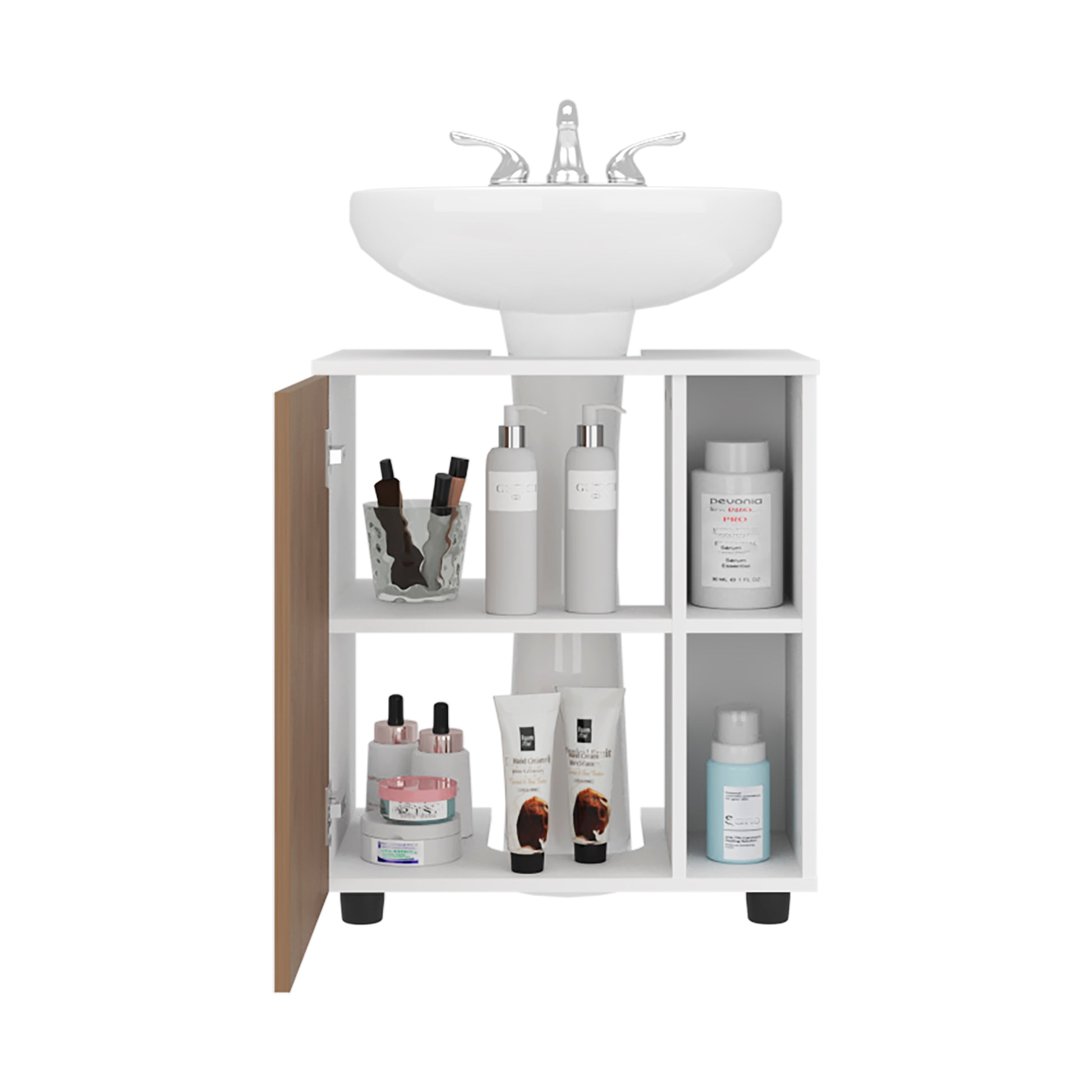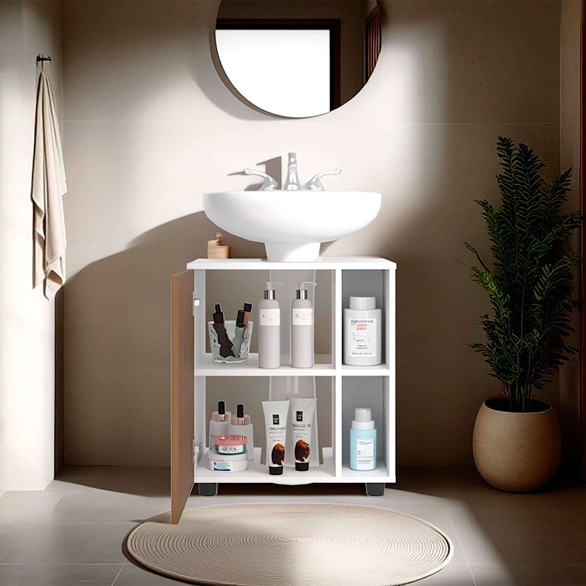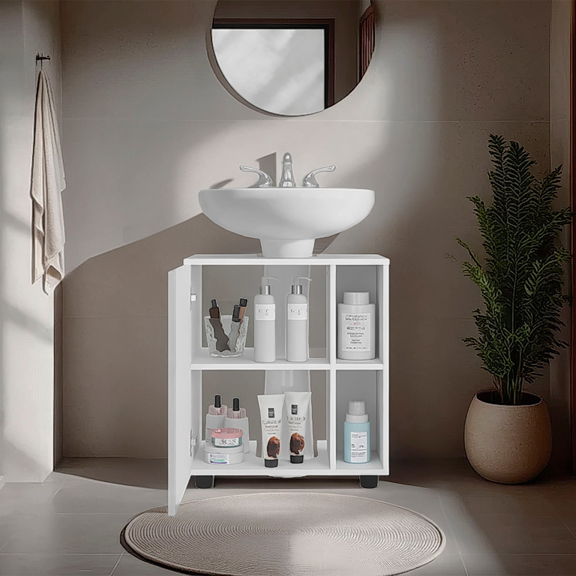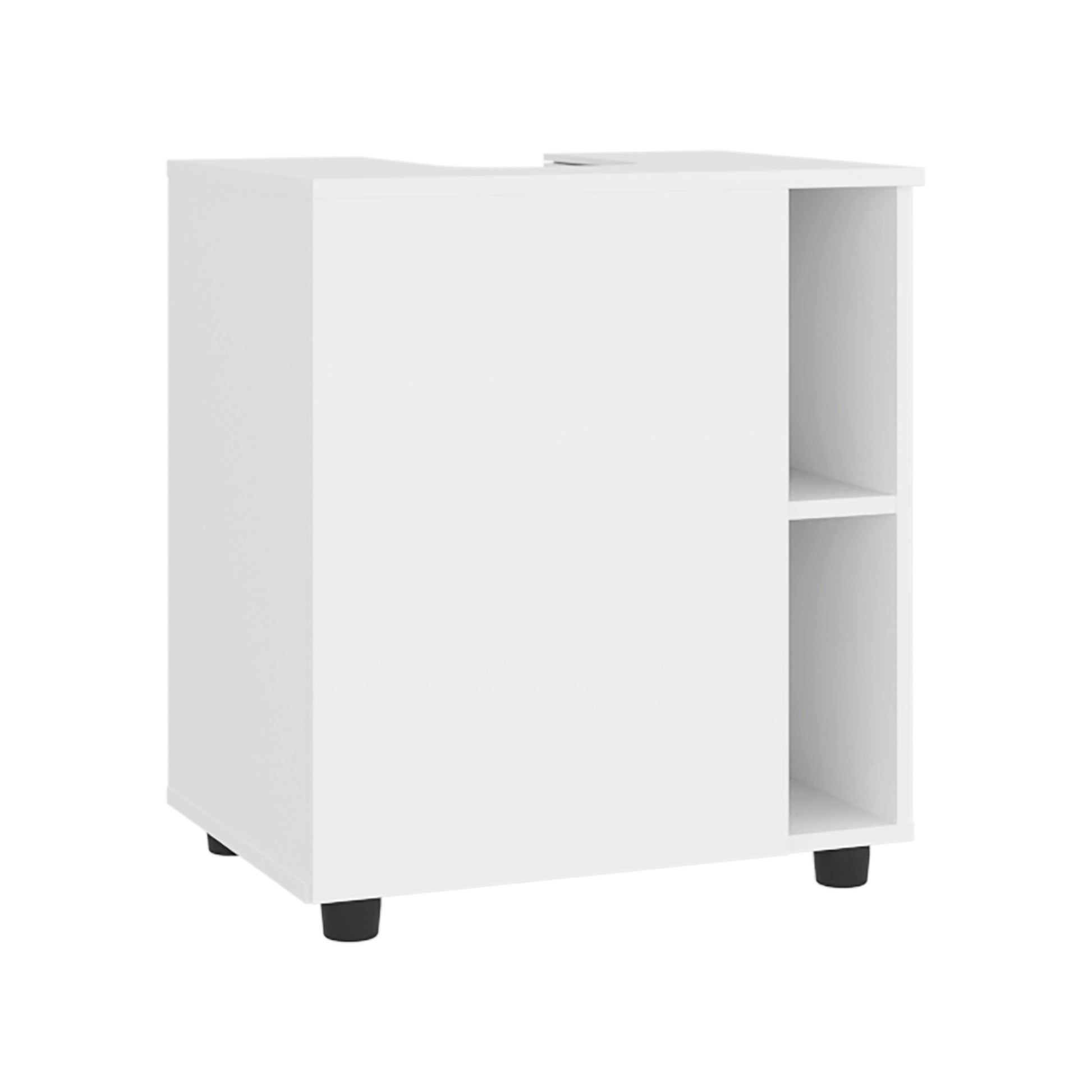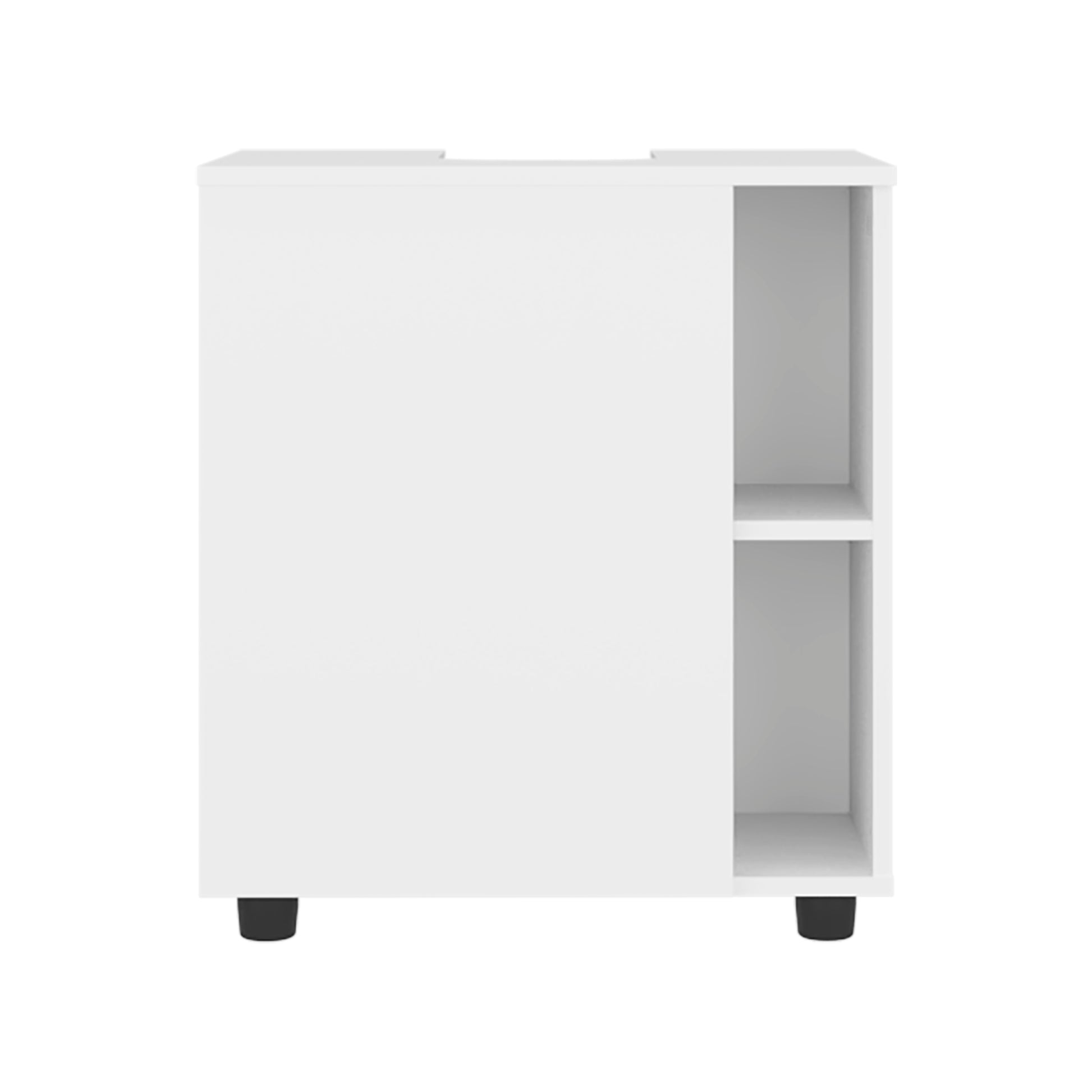 The Pascuale Under Sink Cabinet in all white offers a sleek, minimal solution for bathroom organization. Designed with a center cut-out to fit around sink plumbing, it includes two hinged doors that open to reveal ample interior storage. At 23.6 inches wide, it’s a perfect fit for small spaces like guest bathrooms, powder rooms, or studio apartments seeking functionality with clean lines.