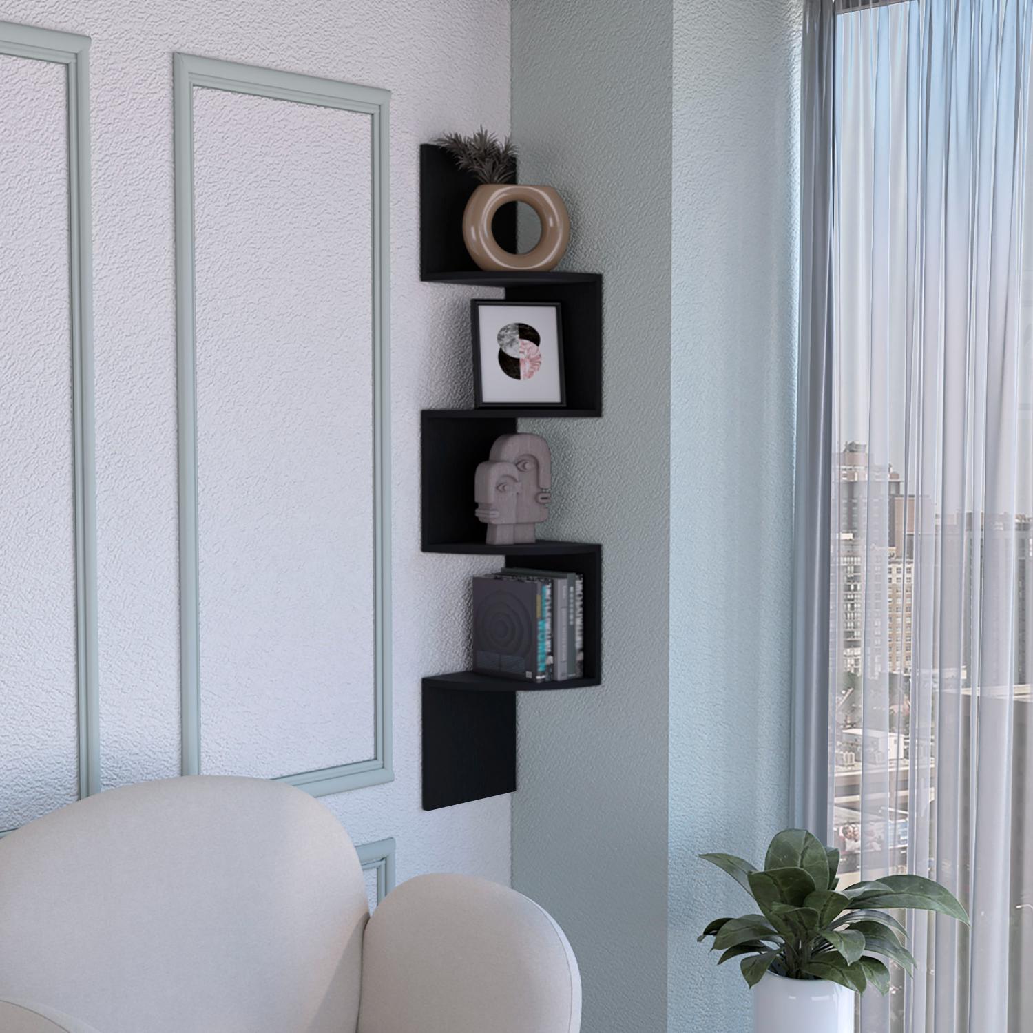 Introducing the Rosset Floating Shelf – a modern solution to utilize corner spaces with style and functionality. Specially crafted for wall corners, this unique shelf offers a seamless, full-wall assembly, enhancing any room with its contemporary design. It features four shelves measuring 9.8"W x 9.8"H, providing ample space for decorative items, books, or plants. Whether you choose the black or the white manufactured wood finish, the Rosset Floating Shelf will surely add a distinctive flair to your decor.